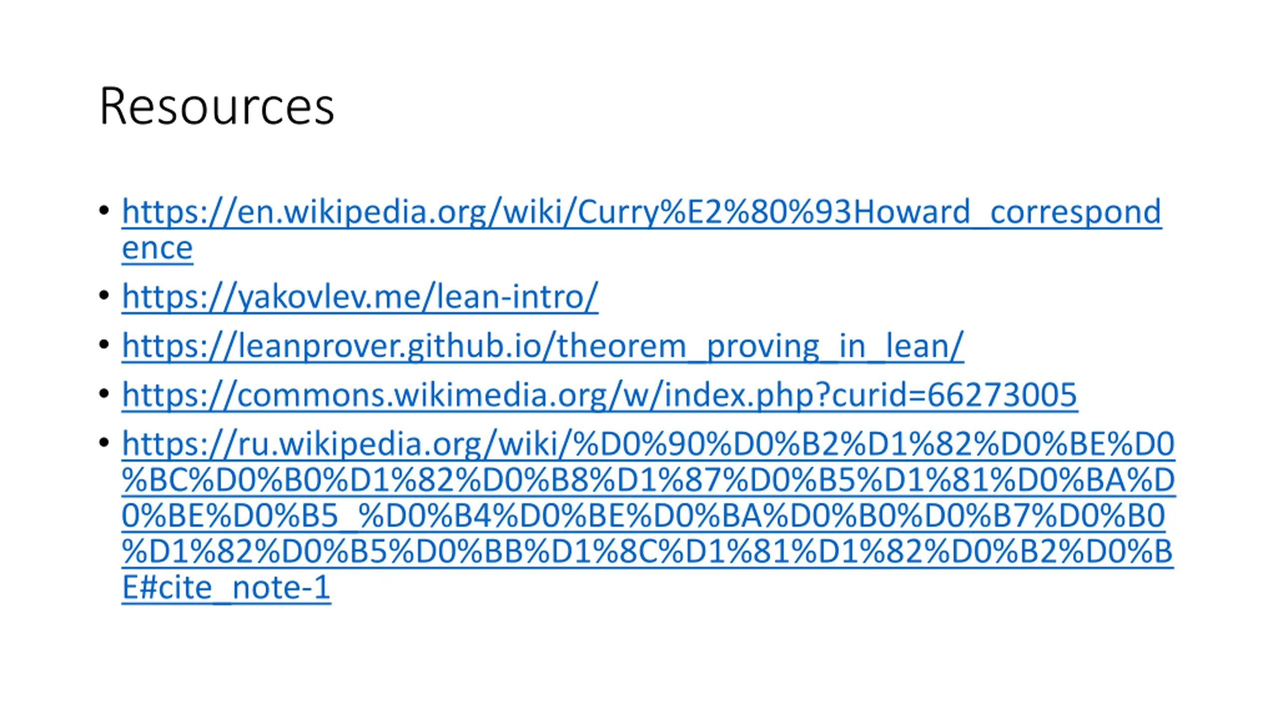 Resources https://en.wikipedia.org/wiki/Curry%E2%80%93Howard_correspond ence https://yakovlev.me/lean-intro/ https://leanprover.github.io/theorem_proving_in_lean/ https://commons.wikimedia.org/w/index.php?curid=66273005 https://ru.wikipedia.org/wiki/%D0%90%D0%B2%D1%82%D0%BE%D0 %BC%D0%B0%D1%82%D0%B8%D1%87%D0%B5%D1%81%D0%BA%D 0%BE%D0%B5_%D0%B4%D0%BE%D0%BA%D0%B0%D0%B7%D0%B0 %D1%82%D0%B5%D0%BB%D1%8C%D1%81%D1%82%D0%B2%D0%B E#cite_note-1