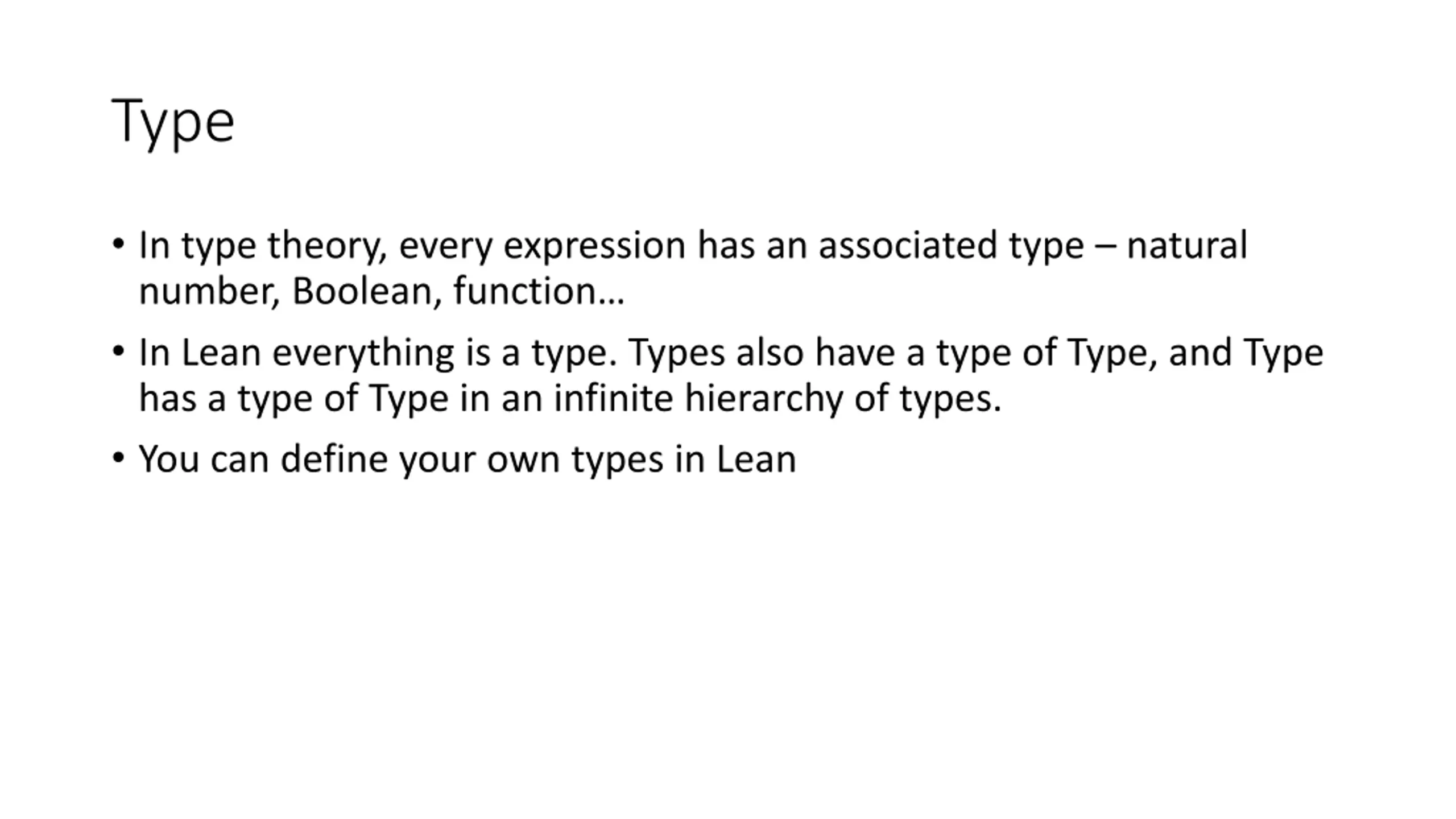 Type In type theory, every expression has an associated type natural number, Boolean, function In Lean everything is a type. Types also have a type of Type, and Type has a type of Type in an infinite hierarchy of types. You can define your own types in Lean
