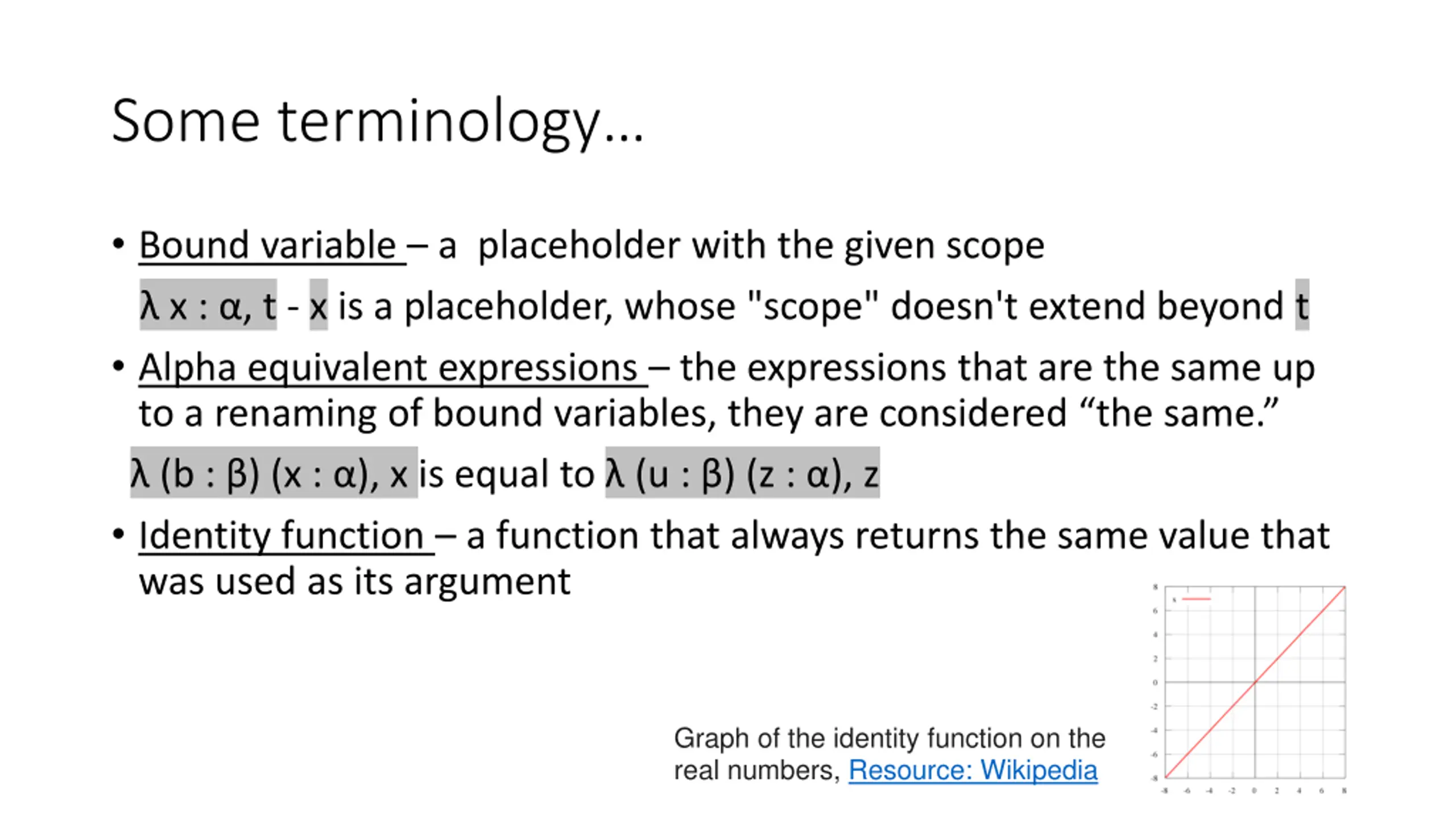 Some terminology Bound variable a placeholder with the given scope x : , t - x is a placeholder, whose "scope" doesn't extend beyond t Alpha equivalent expressions the expressions that are the same up to a renaming of bound variables, they are considered the same. (b : ) (x : ), x is equal to (u : ) (z : ), z Identity function a function that always returns the same value that was used as its argument Graph of the identity function on the real numbers, Resource: Wikipedia
