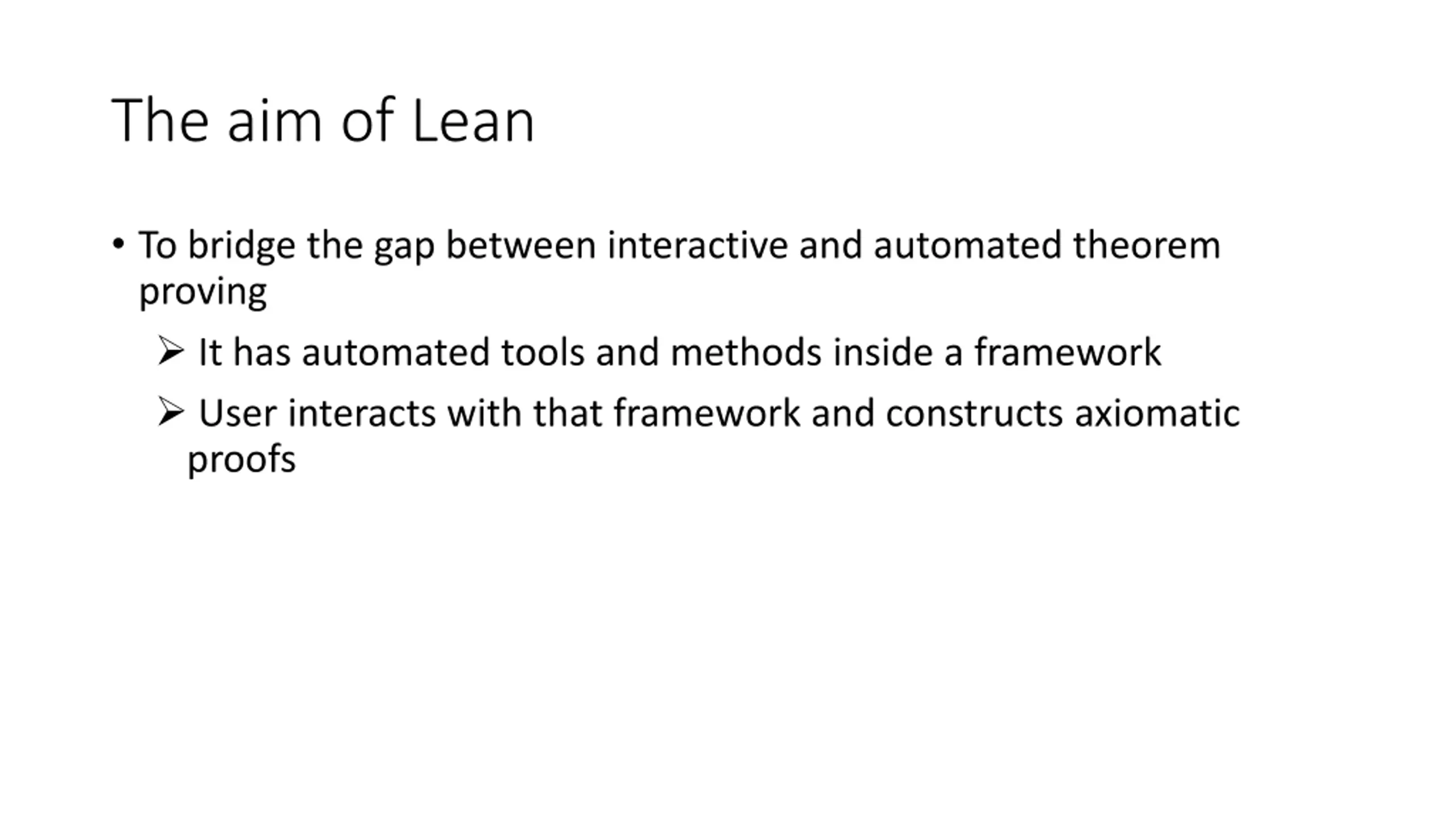The aim of Lean To bridge the gap between interactive and automated theorem proving It has automated tools and methods inside a framework User interacts with that framework and constructs axiomatic proofs