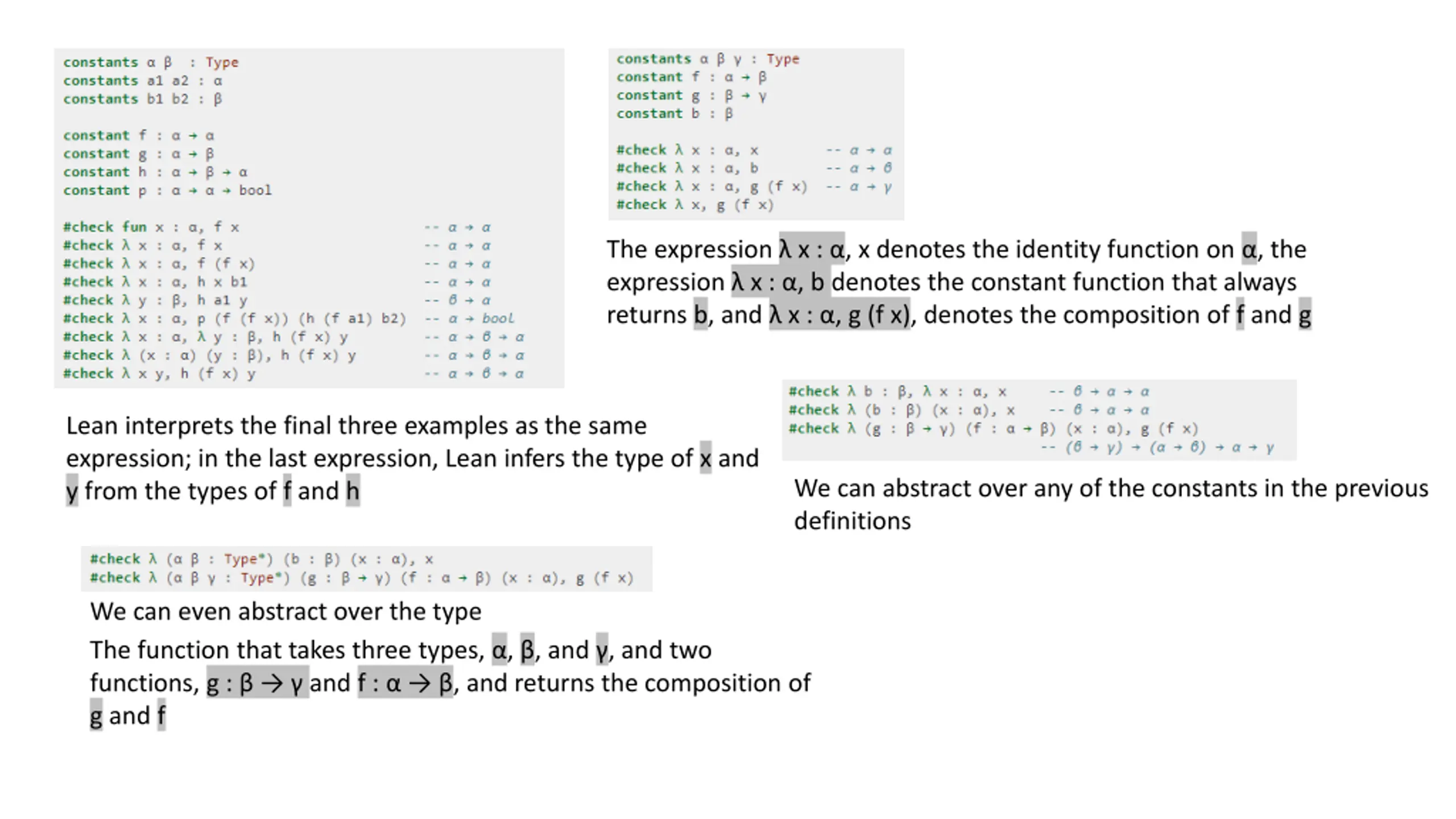 The expression x : , x denotes the identity function on , the expression x : , b denotes the constant function that always returns b, and x : , g (f x), denotes the composition of f and g Lean interprets the final three examples as the same expression; in the last expression, Lean infers the type of x and y from the types of f and h We can abstract over any of the constants in the previous definitions We can even abstract over the type The function that takes three types, , , and , and two functions, g : and f : , and returns the composition of g and f