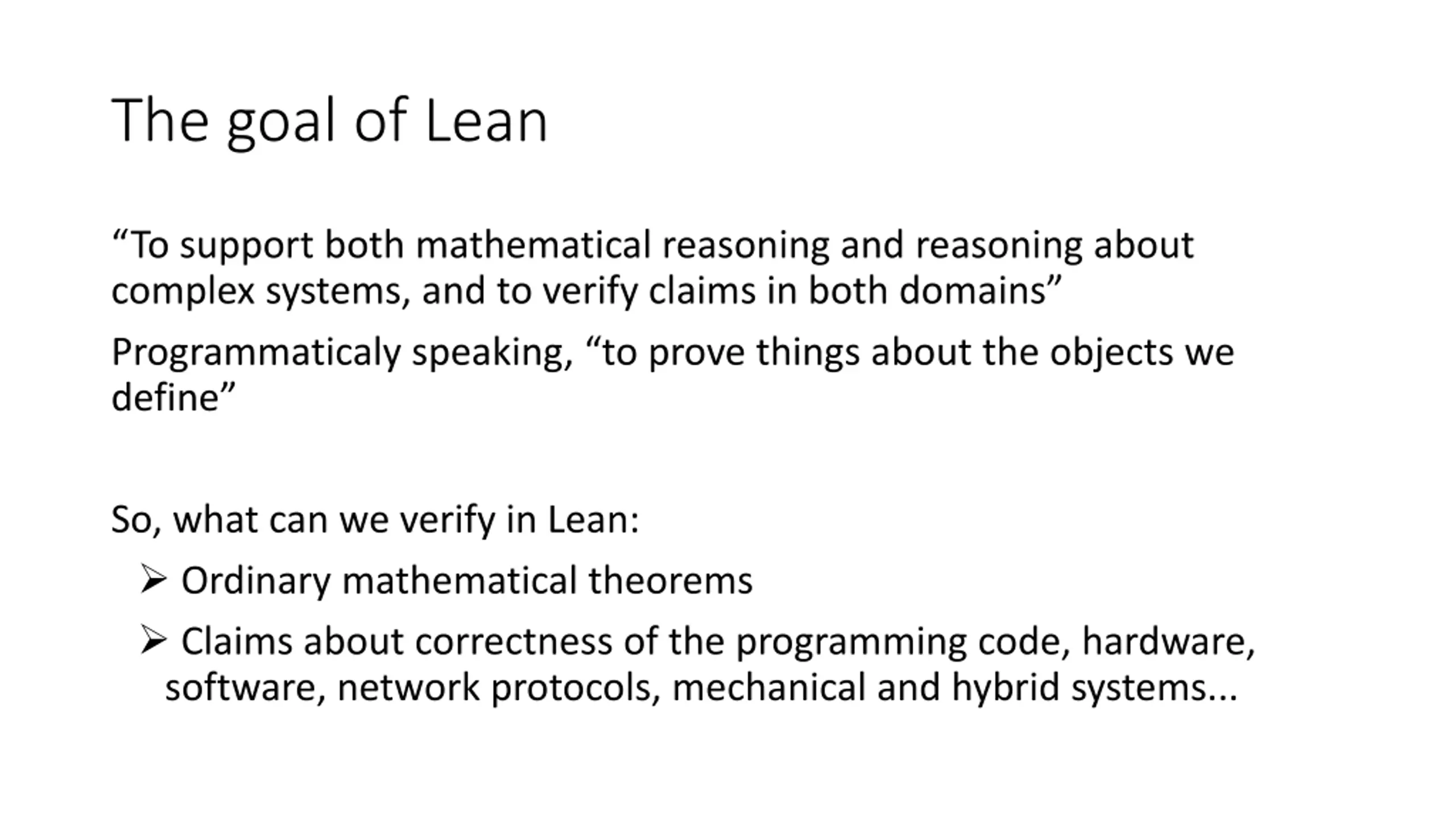 The goal of Lean To support both mathematical reasoning and reasoning about complex systems, and to verify claims in both domains Programmaticaly speaking, to prove things about the objects we define So, what can we verify in Lean: Ordinary mathematical theorems Claims about correctness of the programming code, hardware, software, network protocols, mechanical and hybrid systems...
