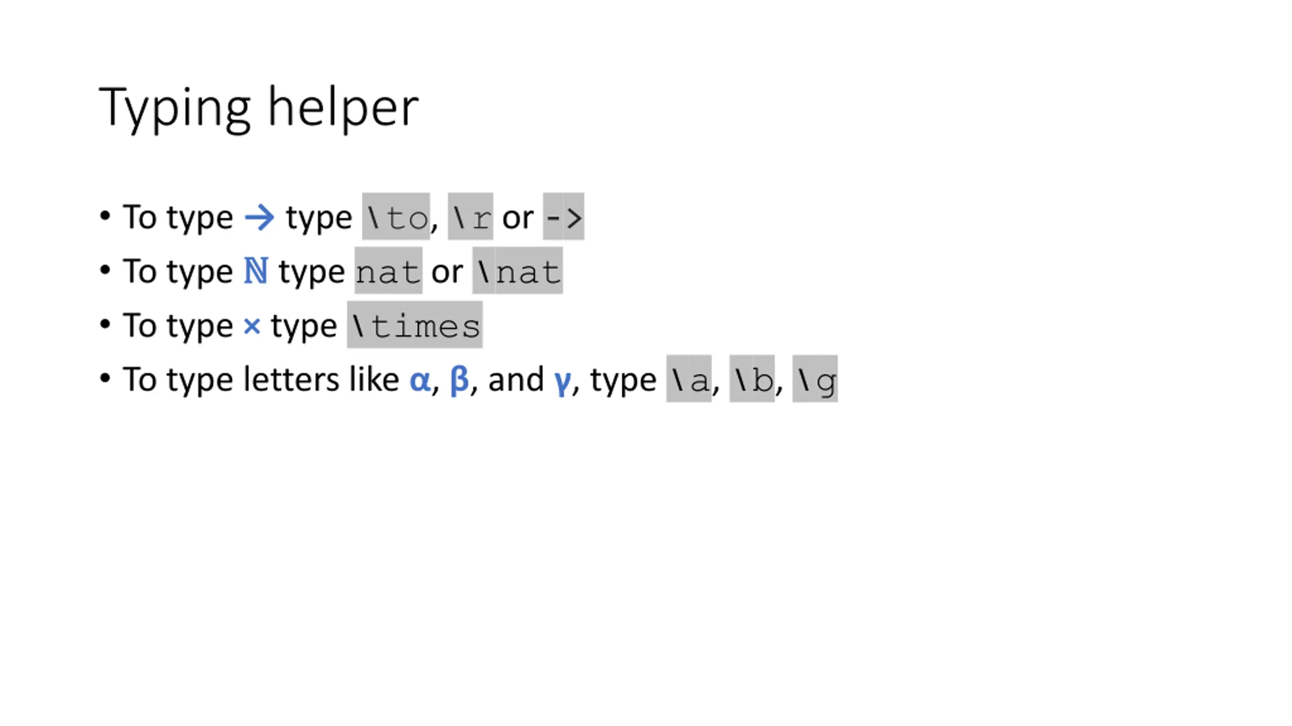 Typing helper To type type \to, \r or -> To type type nat or \nat To type type \times To type letters like , , and , type \a, \b, \g