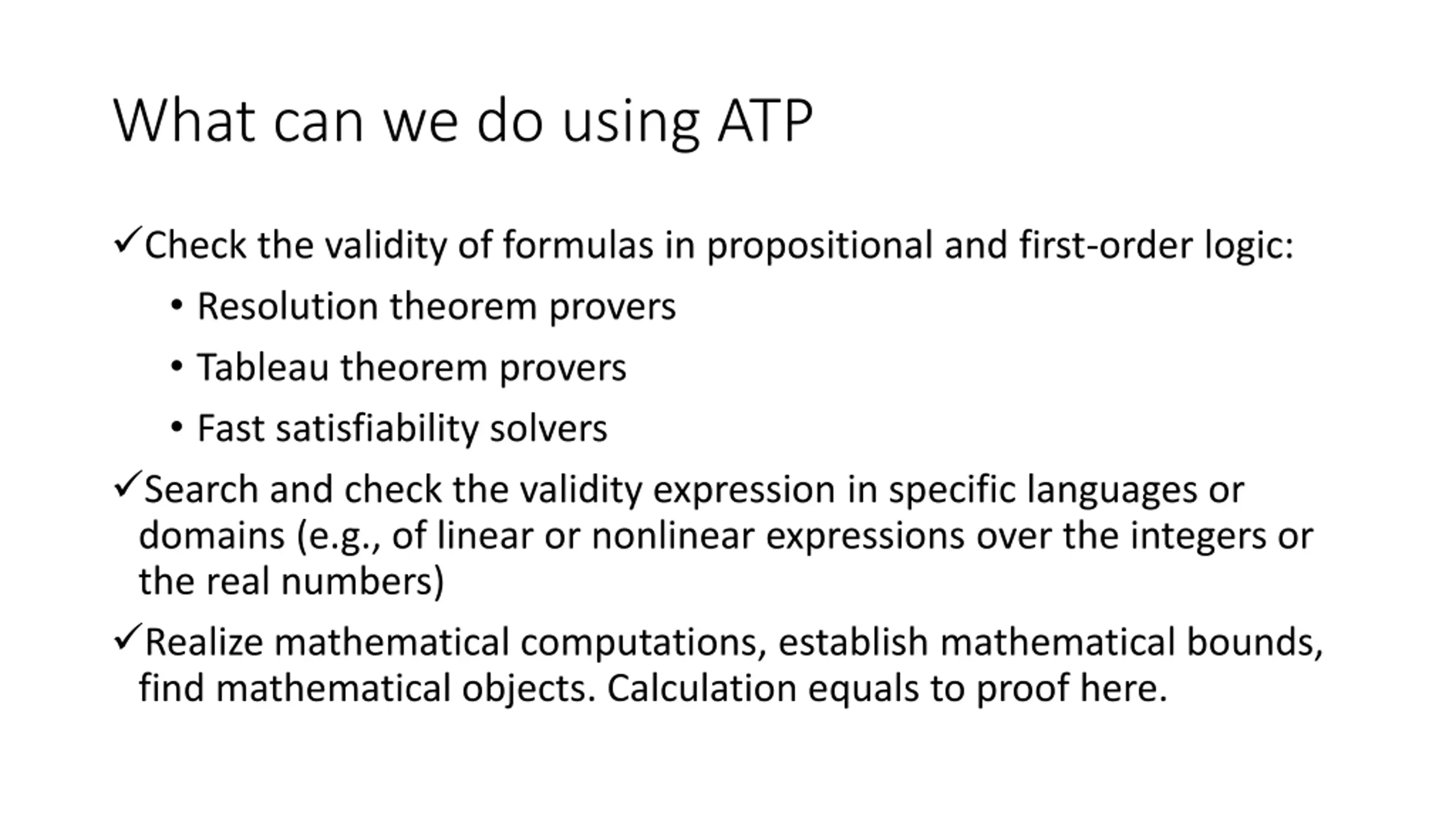 What can we do using ATP Check the validity of formulas in propositional and first-order logic: Resolution theorem provers Tableau theorem provers Fast satisfiability solvers Search and check the validity expression in specific languages or domains (e.g., of linear or nonlinear expressions over the integers or the real numbers) Realize mathematical computations, establish mathematical bounds, find mathematical objects. Calculation equals to proof here.