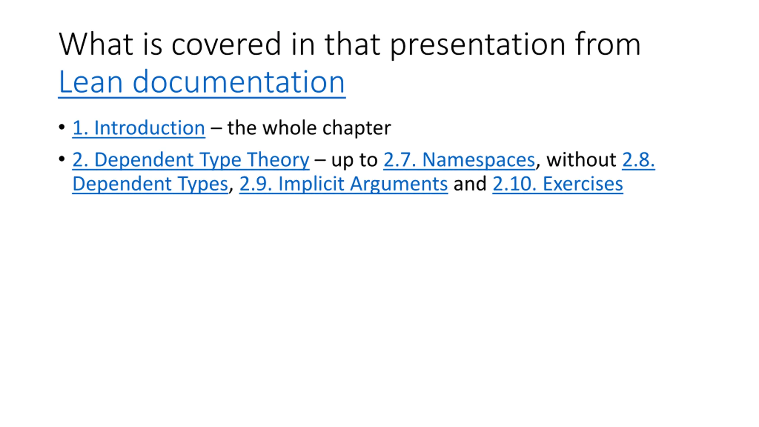 What is covered in that presentation from Lean documentation 1. Introduction the whole chapter 2. Dependent Type Theory up to 2.7. Namespaces, without 2.8. Dependent Types, 2.9. Implicit Arguments and 2.10. Exercises