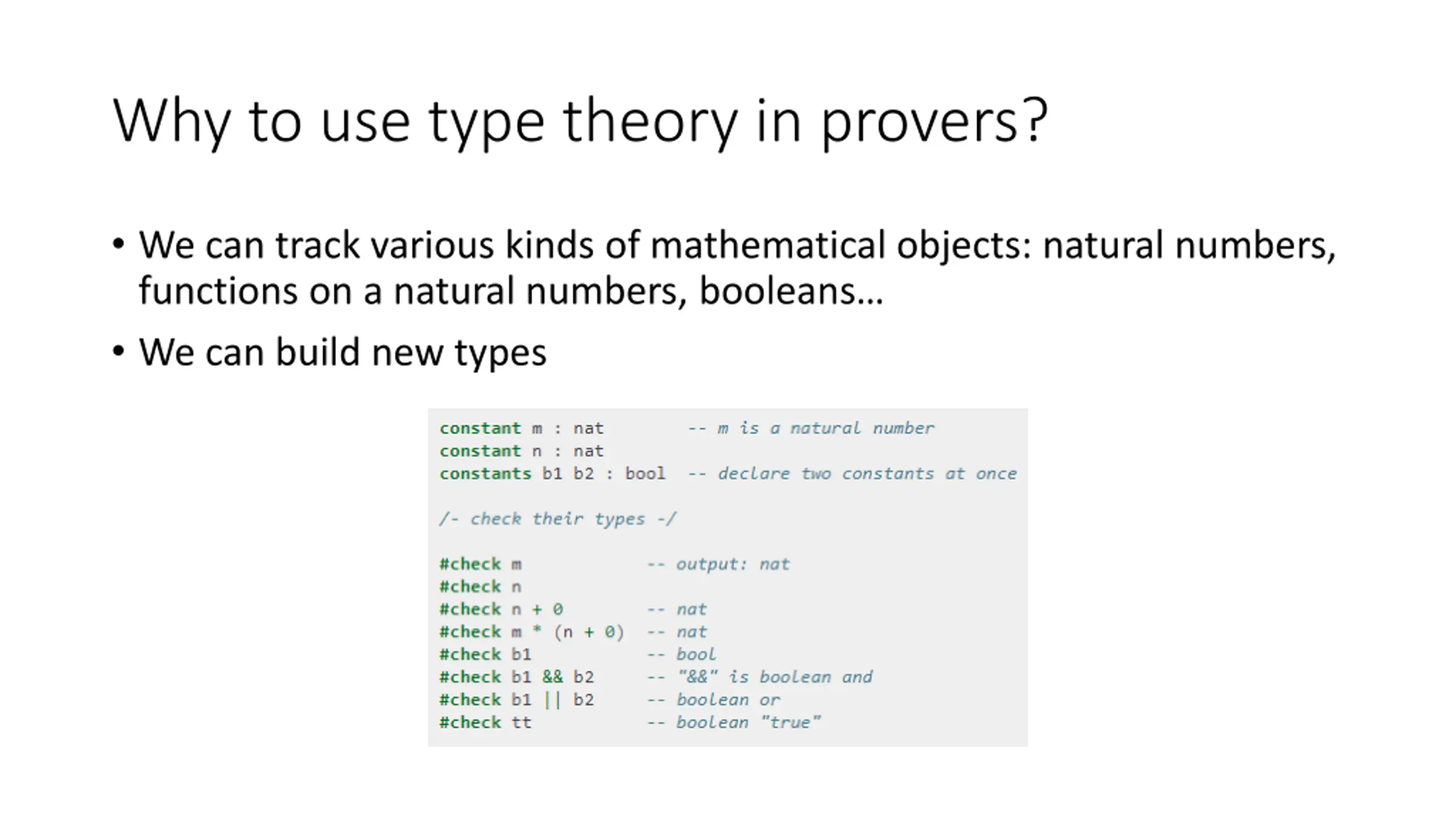 Why to use type theory in provers? We can track various kinds of mathematical objects: natural numbers, functions on a natural numbers, booleans We can build new types