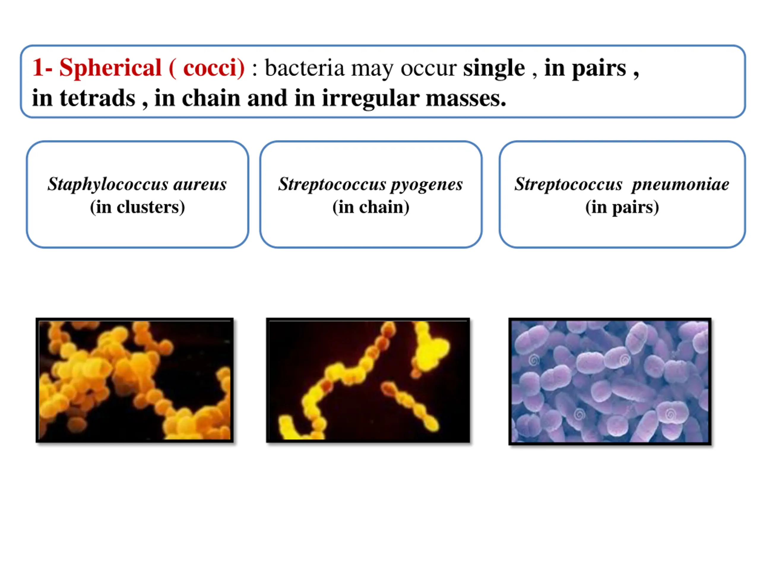 1- Spherical ( cocci) : bacteria may occur single , in pairs , in tetrads , in chain and in irregular masses. Staphylococcus aureus (in clusters) Streptococcus pyogenes (in chain) Streptococcus pneumoniae (in pairs)