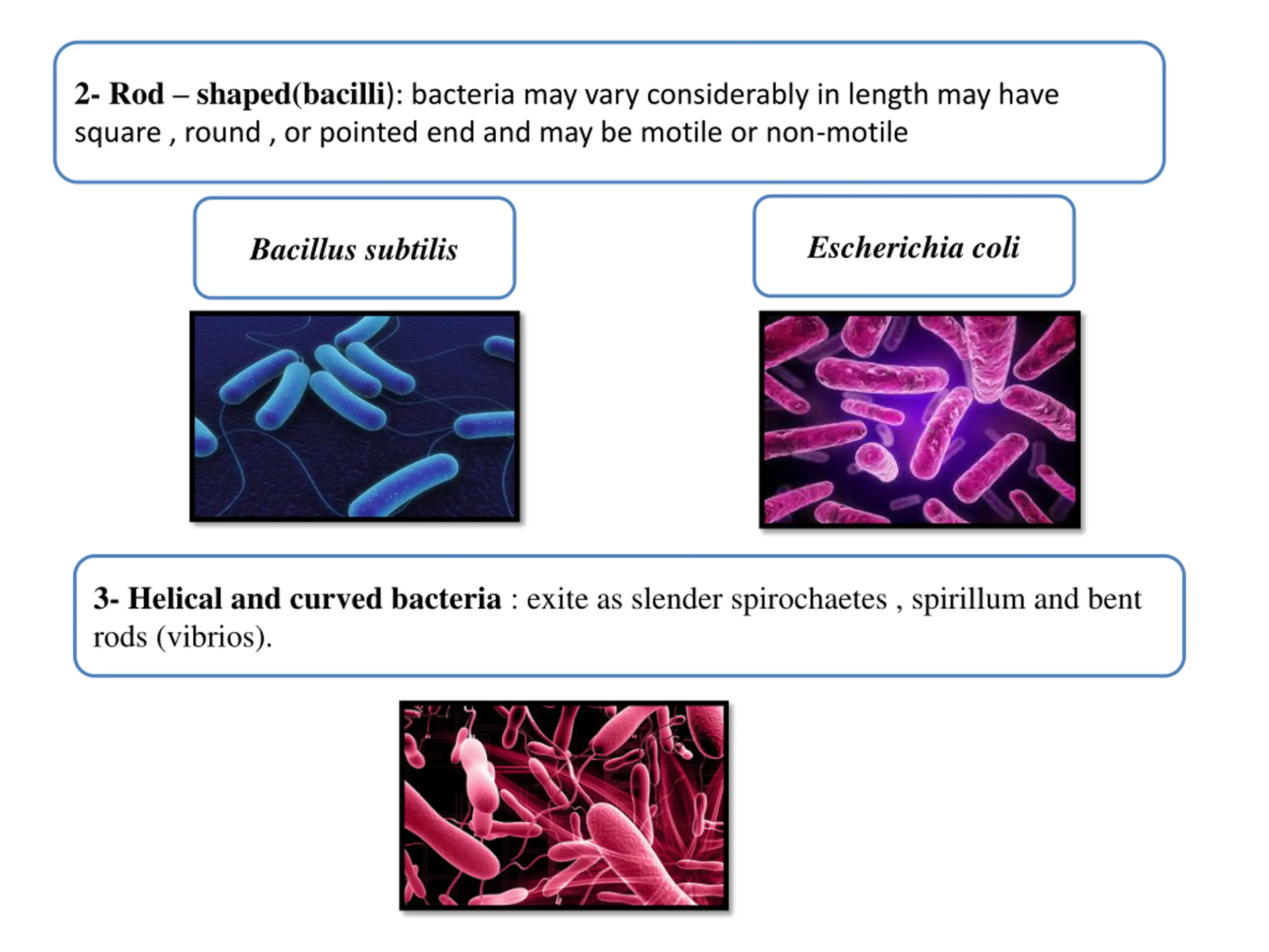 2- Rod shaped(bacilli): bacteria may vary considerably in length may have square , round , or pointed end and may be motile or non-motile Escherichia coli Bacillus subtilis 3- Helical and curved bacteria : exite as slender spirochaetes , spirillum and bent rods (vibrios).