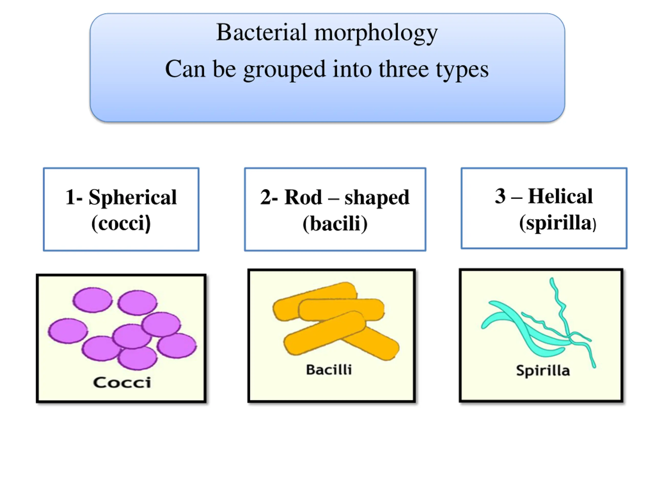 Bacterial morphology Can be grouped into three types 3 Helical (spirilla) 1- Spherical (cocci) 2- Rod shaped (bacili)
