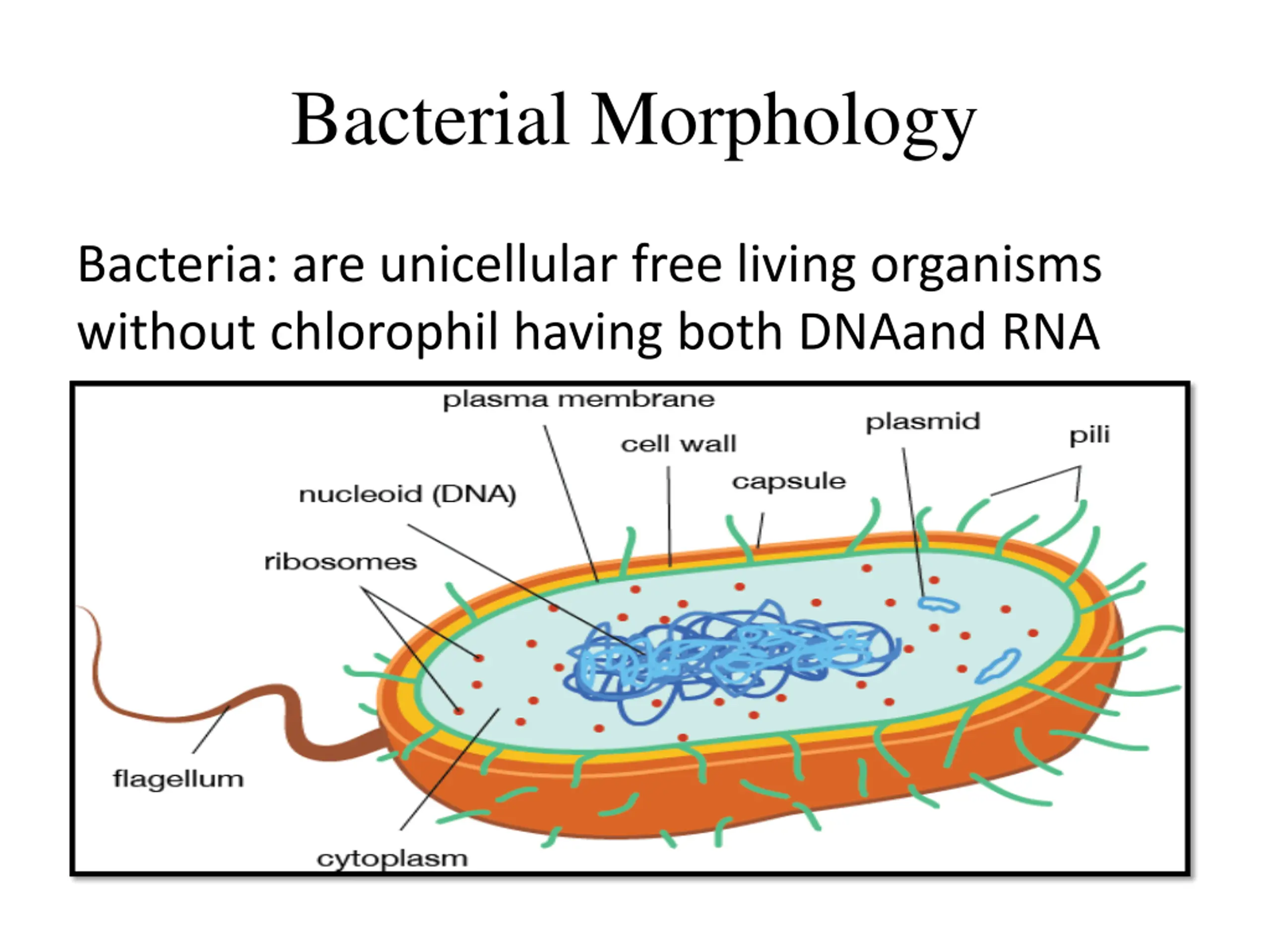 Bacterial Morphology Bacteria: are unicellular free living organisms without chlorophil having both DNAand RNA