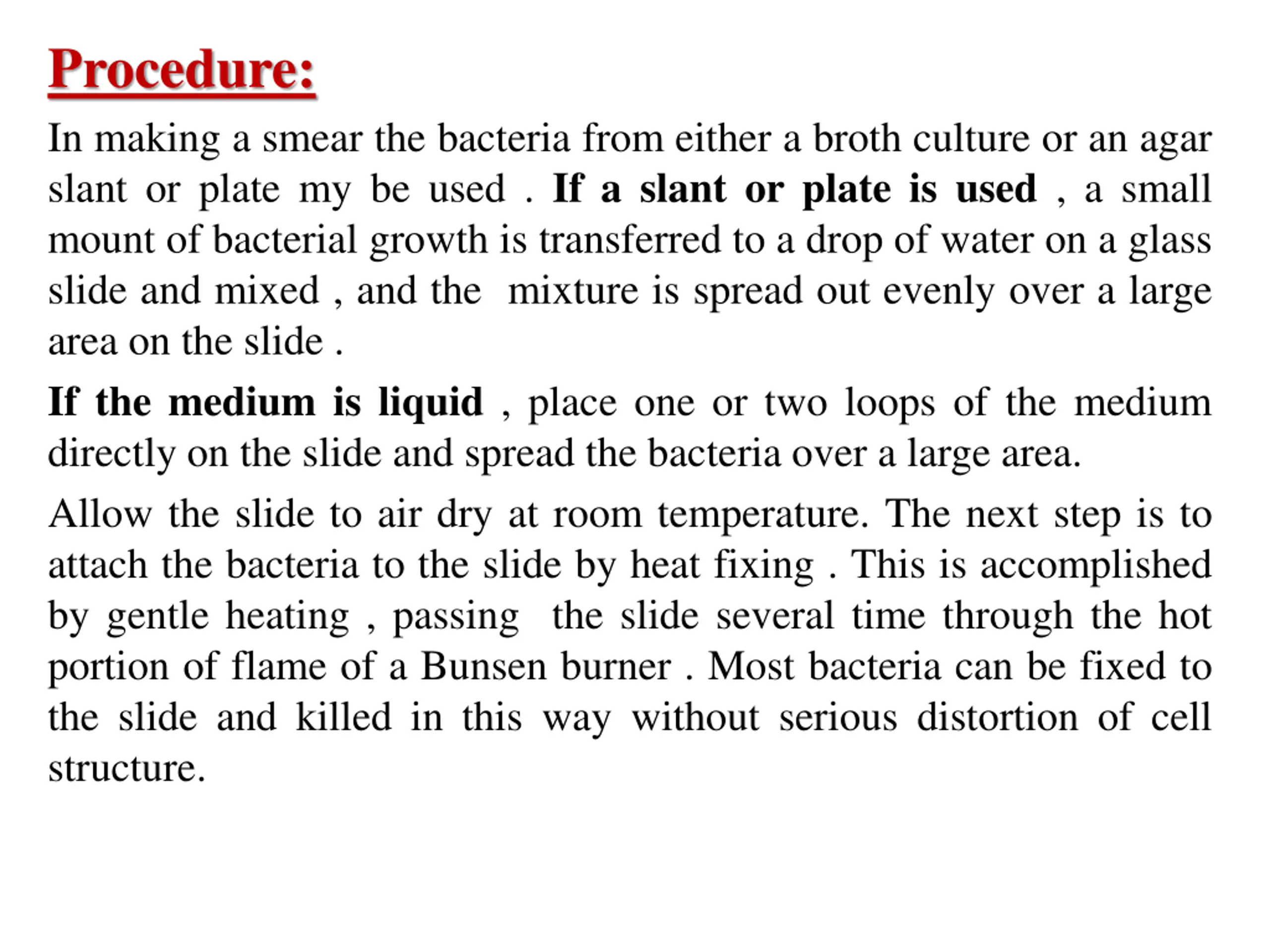 Procedure: In making a smear the bacteria from either a broth culture or an agar slant or plate my be used . If a slant or plate is used , a small mount of bacterial growth is transferred to a drop of water on a glass slide and mixed , and the mixture is spread out evenly over a large area on the slide . If the medium is liquid , place one or two loops of the medium directly on the slide and spread the bacteria over a large area. Allow the slide to air dry at room temperature. The next step is to attach the bacteria to the slide by heat fixing . This is accomplished by gentle heating , passing the slide several time through the hot portion of flame of a Bunsen burner . Most bacteria can be fixed to the slide and killed in this way without serious distortion of cell structure.