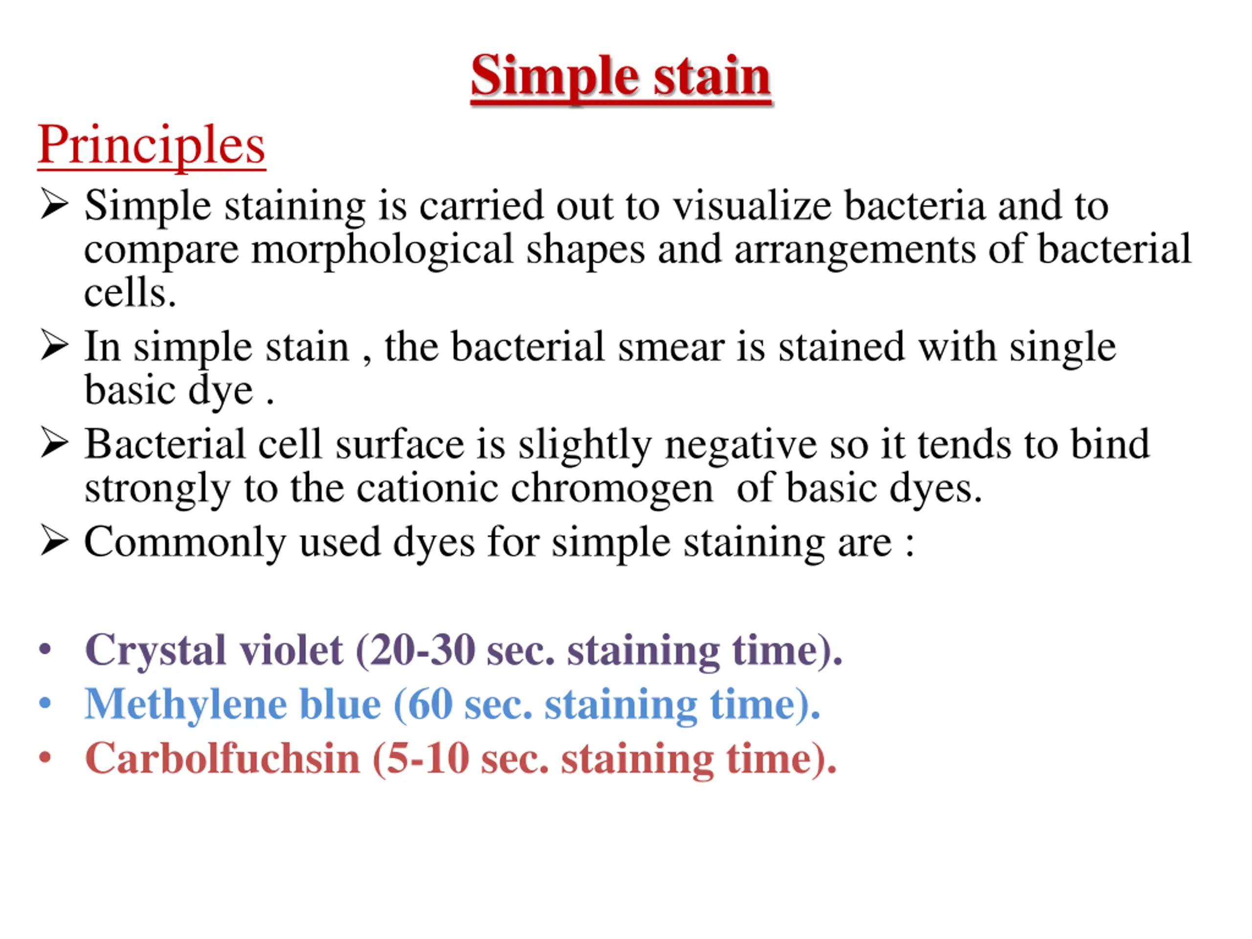 Simple stain Principles Simple staining is carried out to visualize bacteria and to compare morphological shapes and arrangements of bacterial cells. In simple stain , the bacterial smear is stained with single basic dye . Bacterial cell surface is slightly negative so it tends to bind strongly to the cationic chromogen of basic dyes. Commonly used dyes for simple staining are : Crystal violet (20-30 sec. staining time). Methylene blue (60 sec. staining time). Carbolfuchsin (5-10 sec. staining time).
