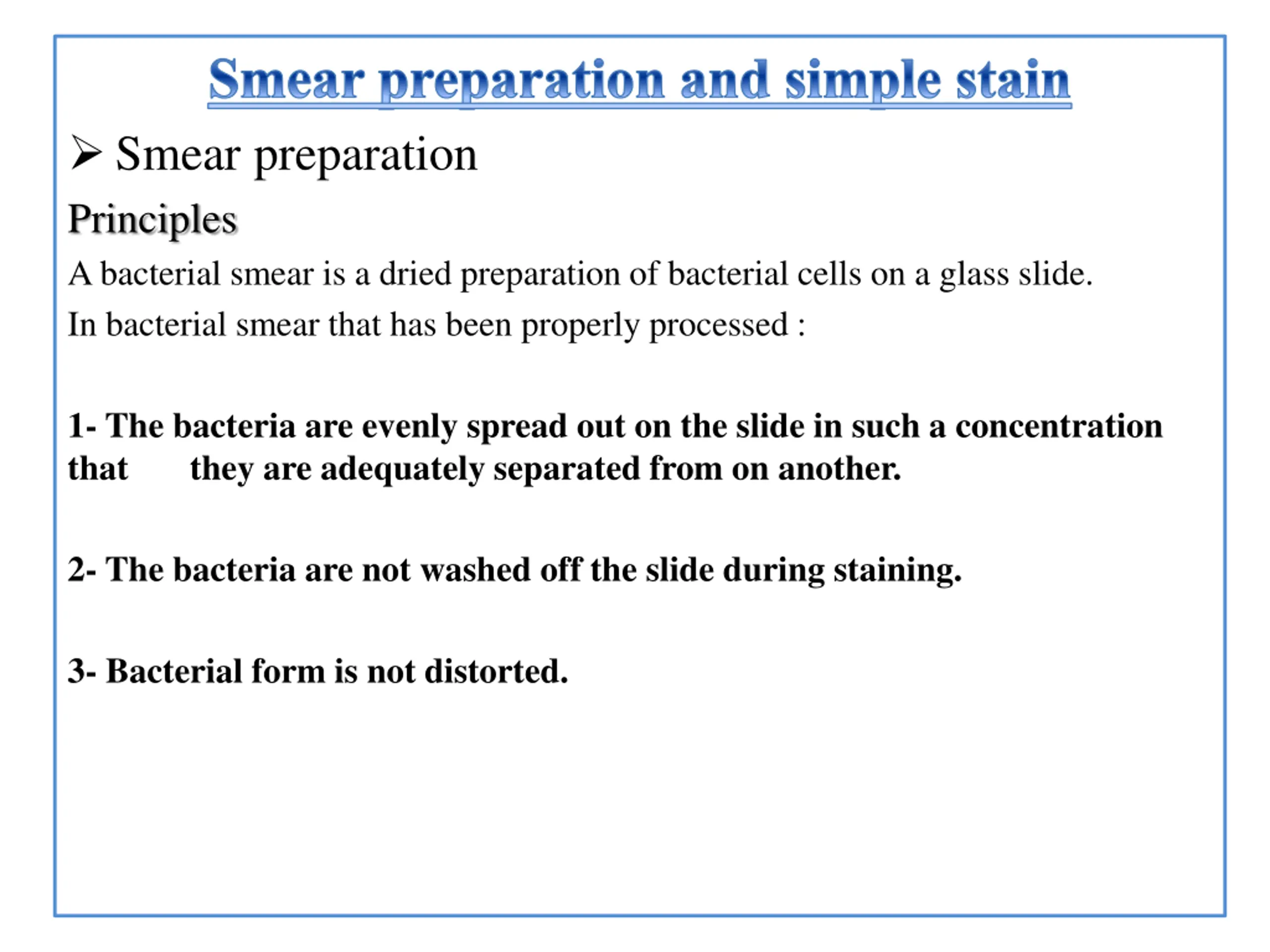 Smear preparation and simple stain Smear preparation Principles A bacterial smear is a dried preparation of bacterial cells on a glass slide. In bacterial smear that has been properly processed : 1- The bacteria are evenly spread out on the slide in such a concentration that they are adequately separated from on another. 2- The bacteria are not washed off the slide during staining. 3- Bacterial form is not distorted.