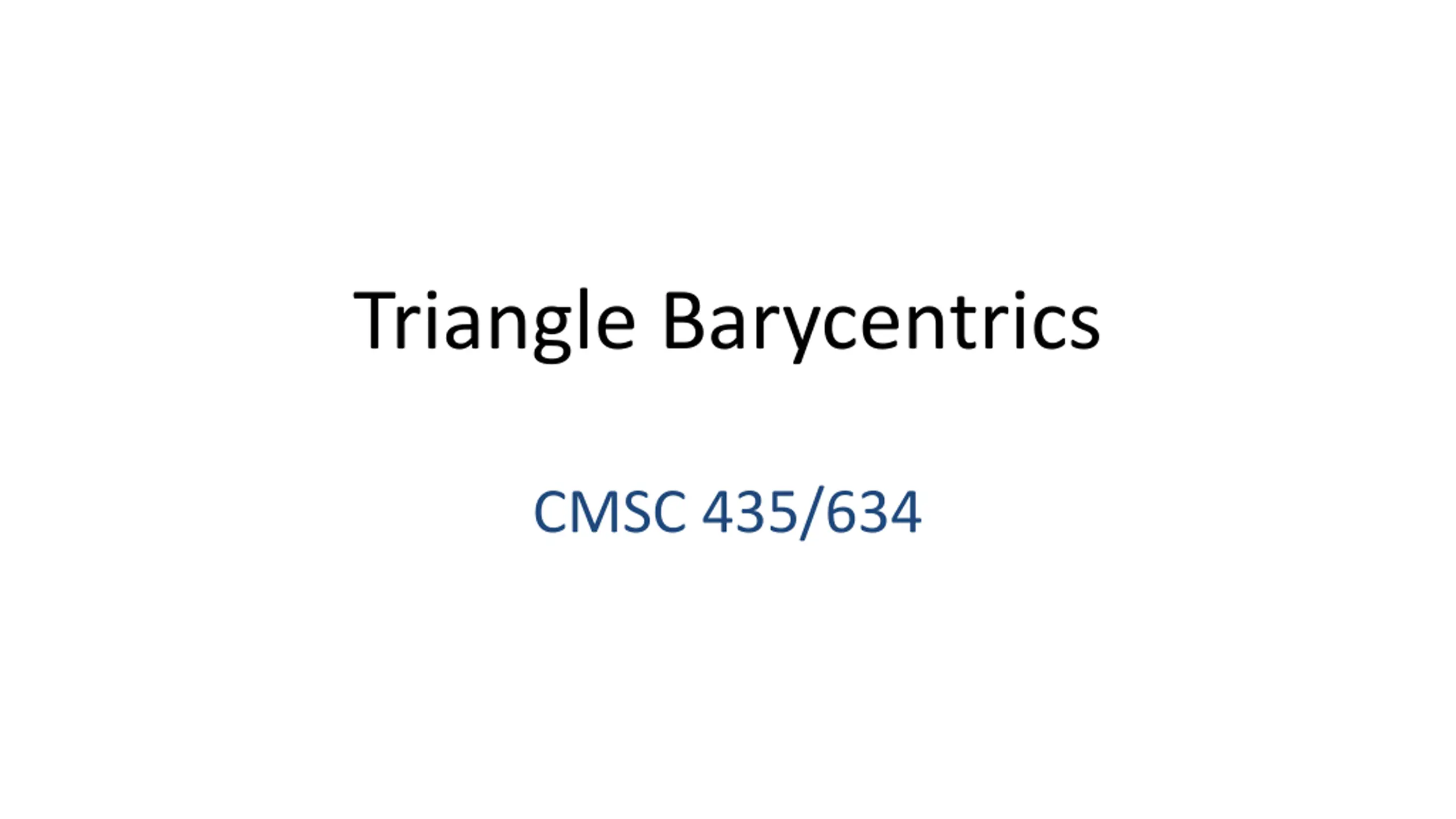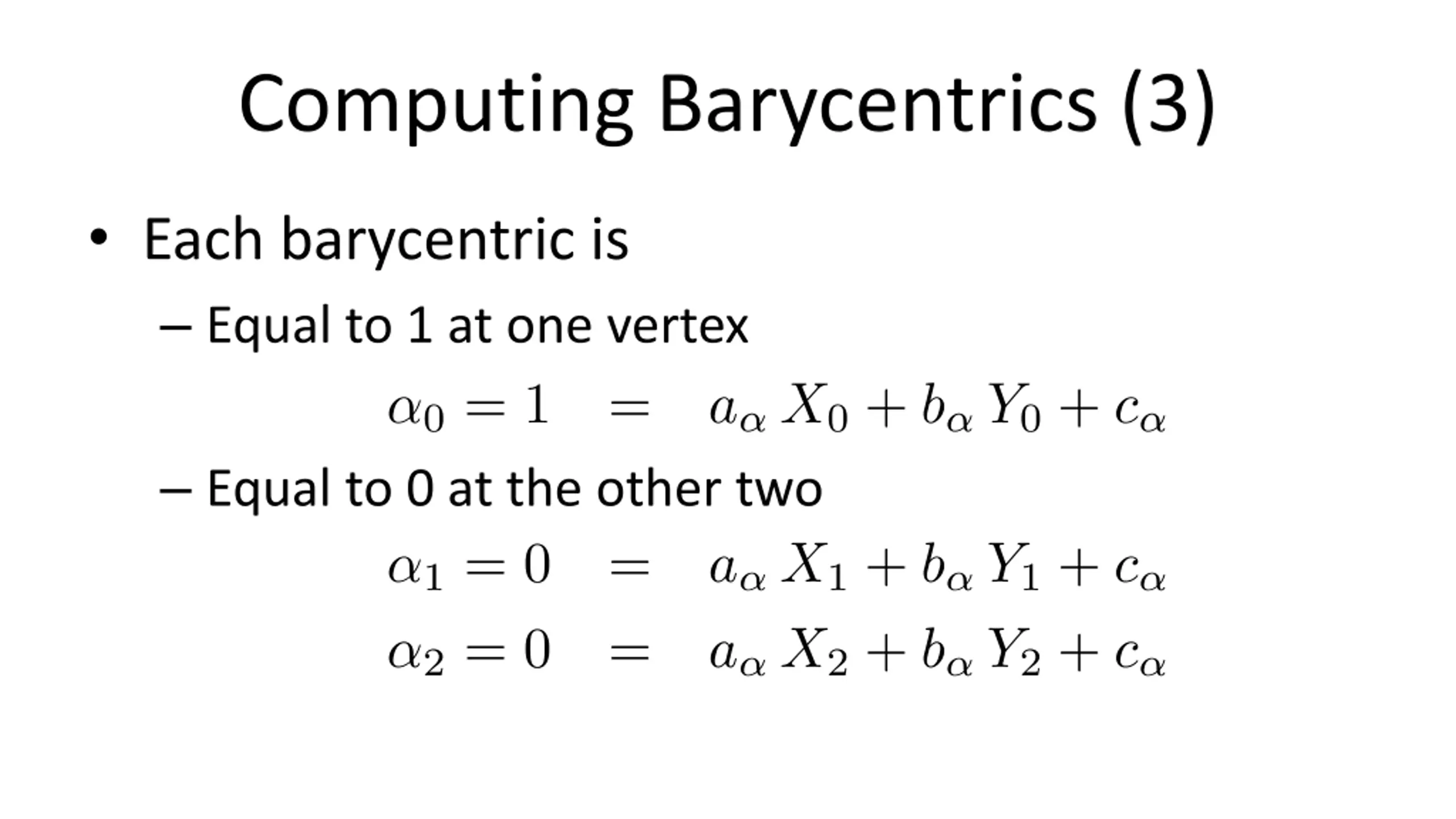 Computing Barycentrics (3) Each barycentric is Equal to 1 at one vertex Equal to 0 at the other two