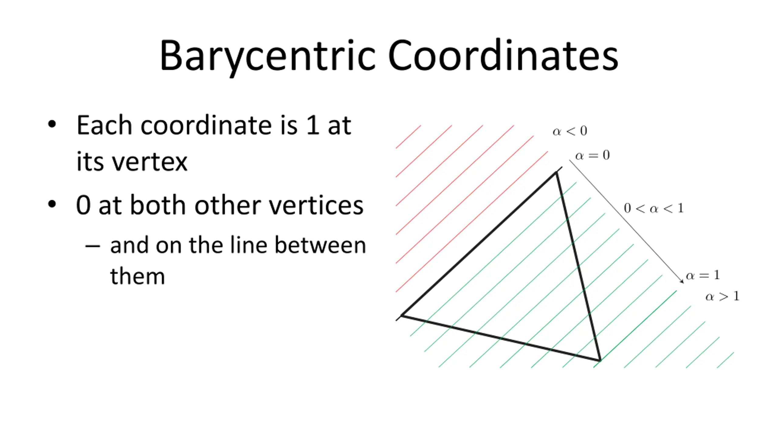 Barycentric Coordinates Each coordinate is 1 at its vertex 0 at both other vertices and on the line between them