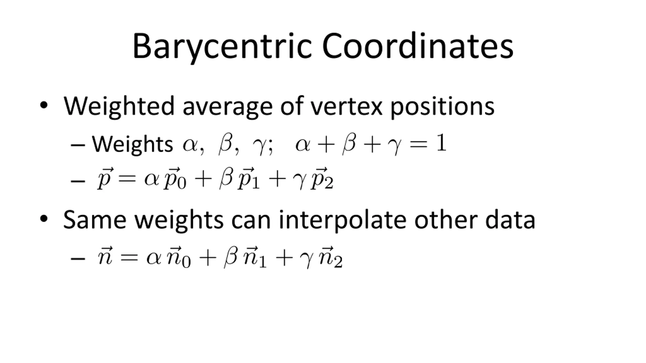 Barycentric Coordinates Weighted average of vertex positions Weights Same weights can interpolate other data