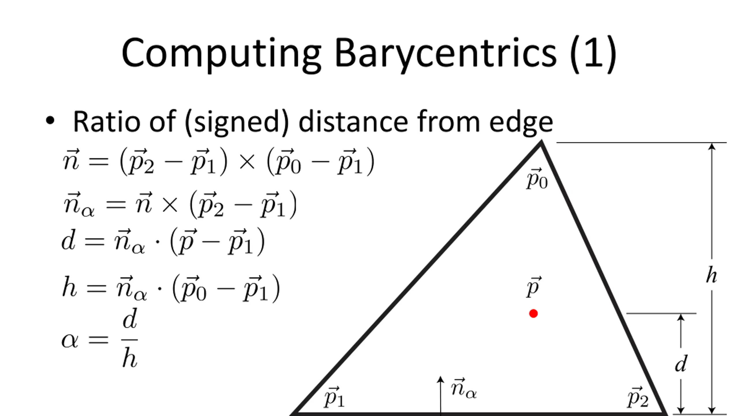 Computing Barycentrics (1) Ratio of (signed) distance from edge h d