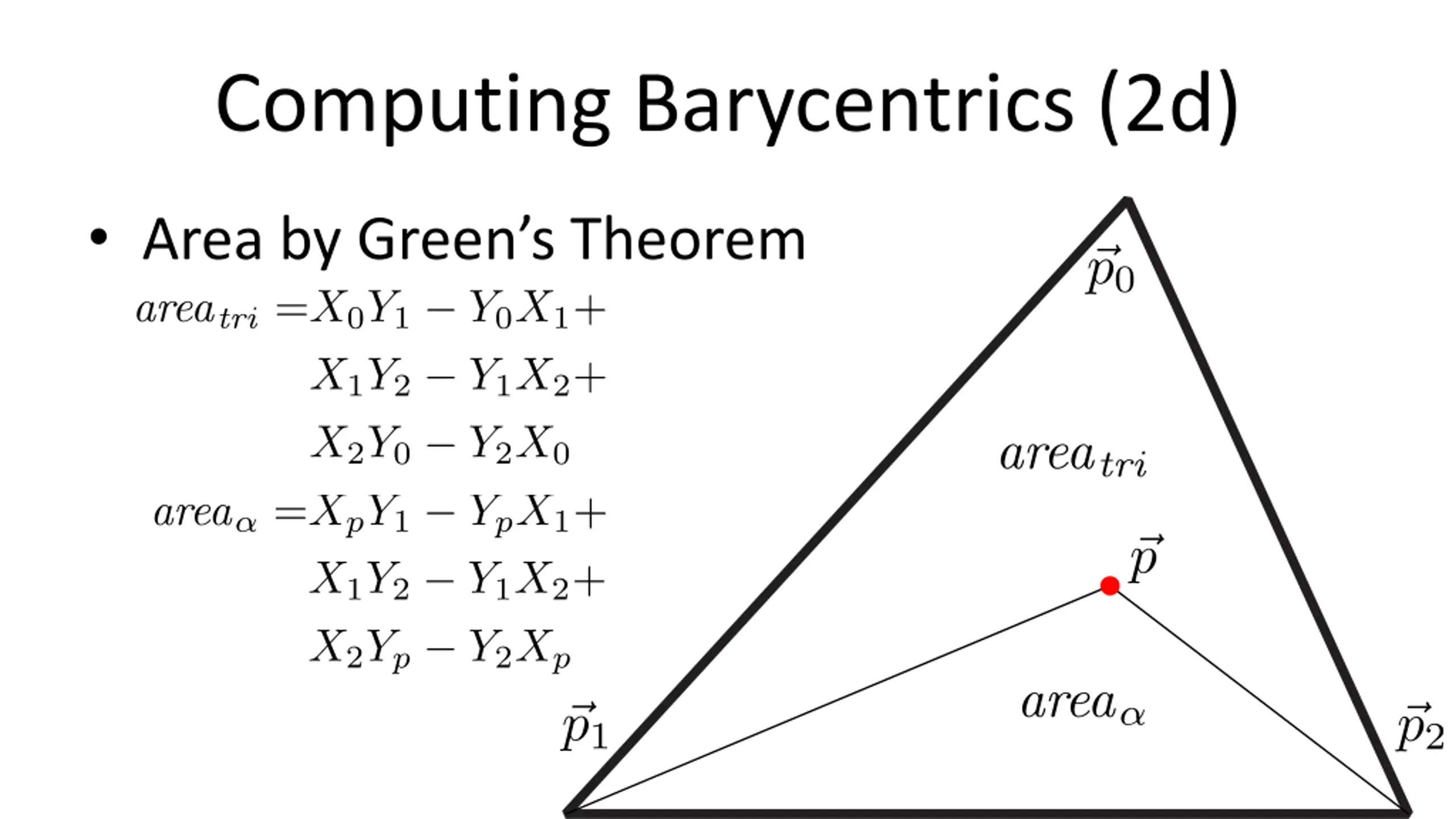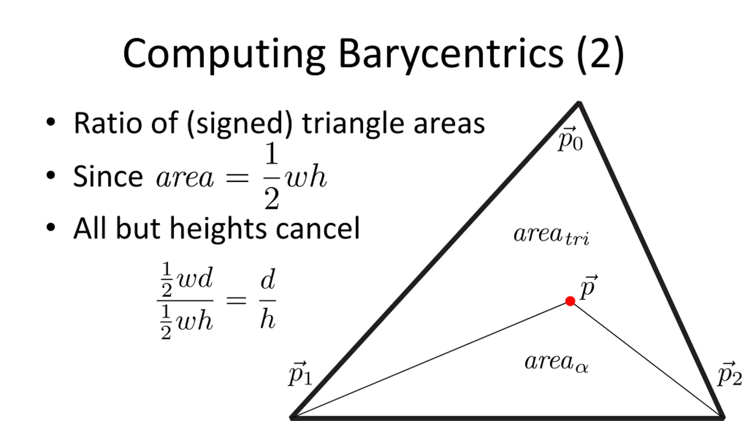 Computing Barycentrics (2) Ratio of (signed) triangle areas Since All but heights cancel