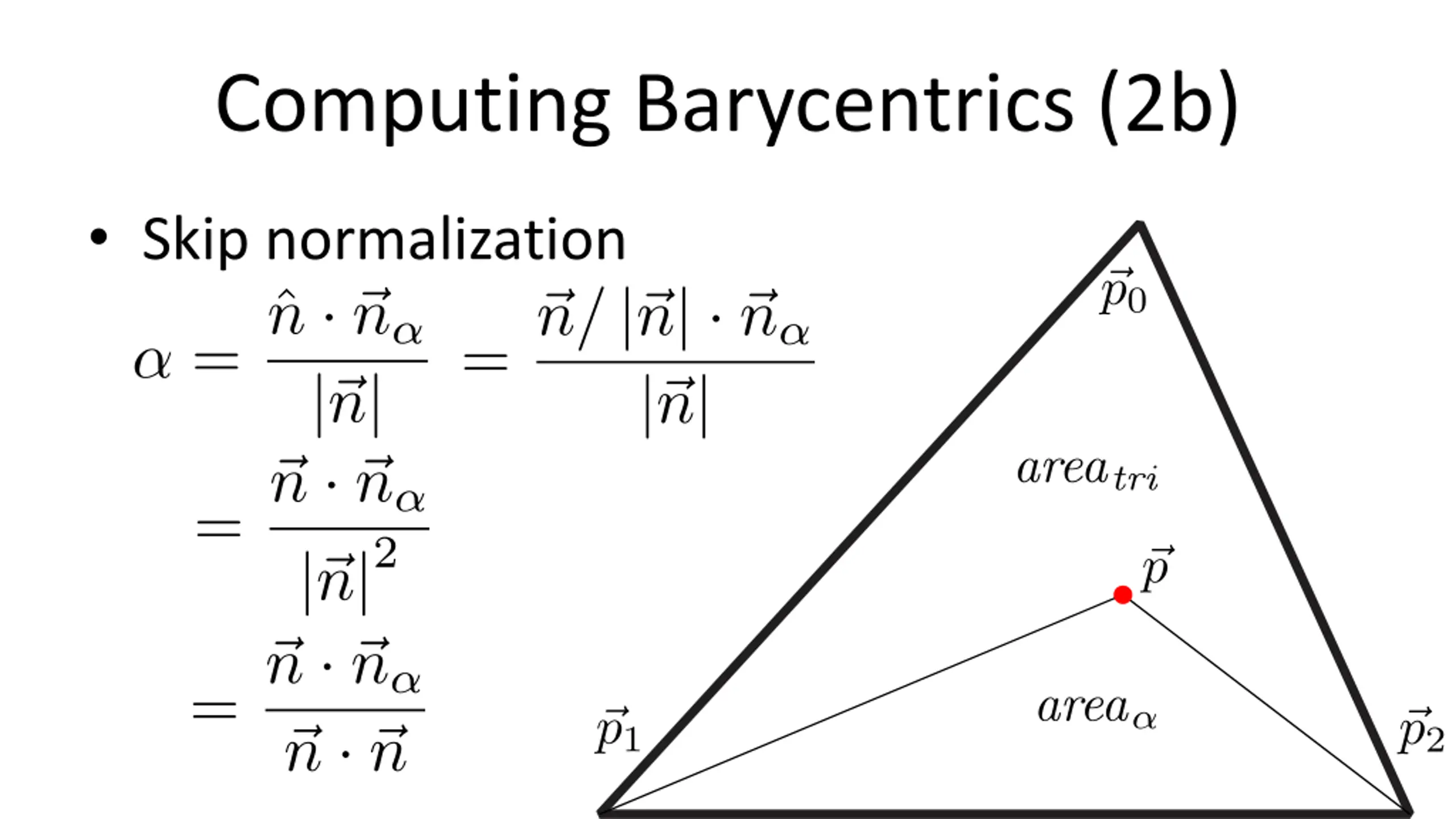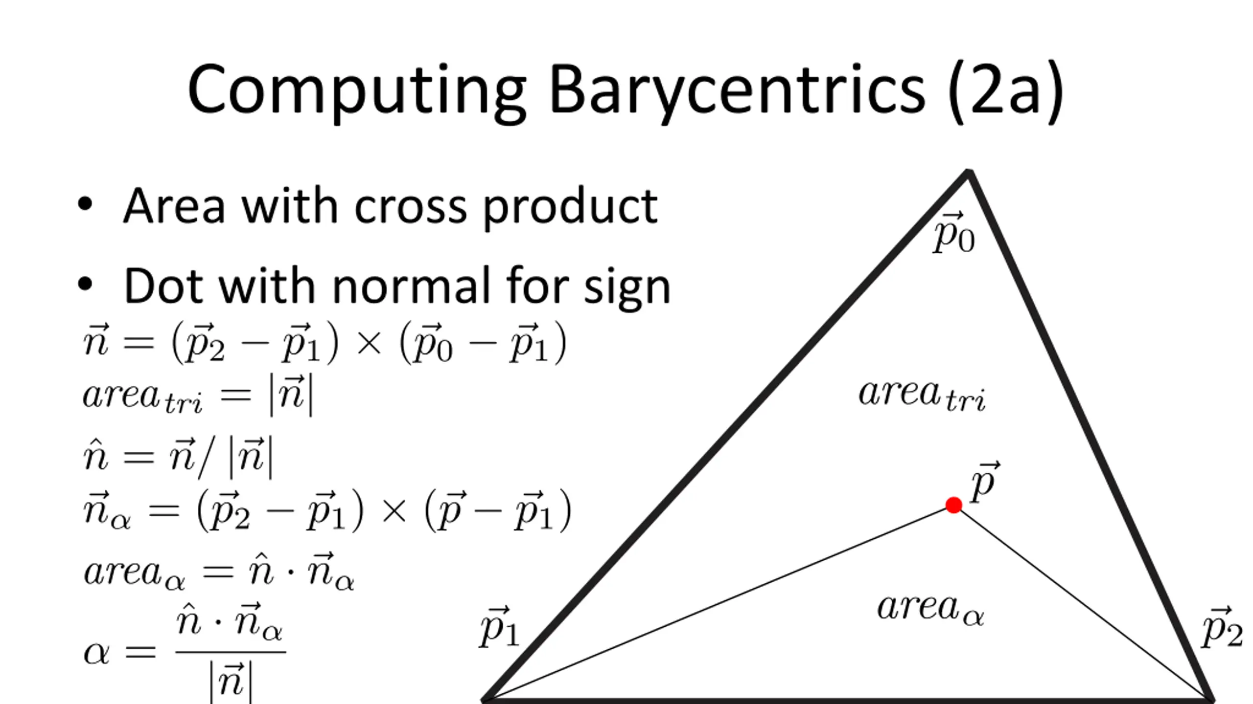 Computing Barycentrics (2a) Area with cross product Dot with normal for sign