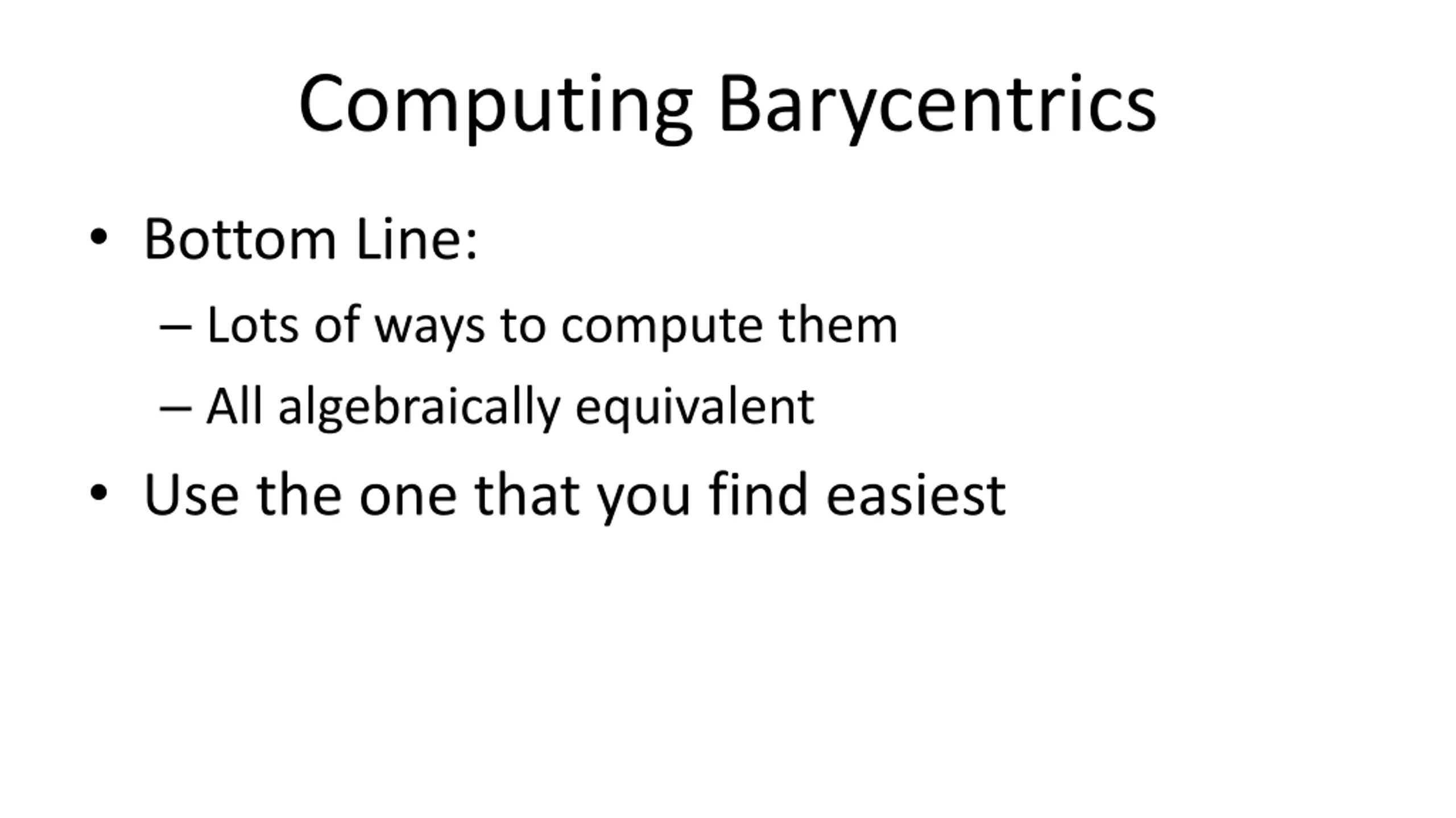 Computing Barycentrics Bottom Line: Lots of ways to compute them All algebraically equivalent Use the one that you find easiest