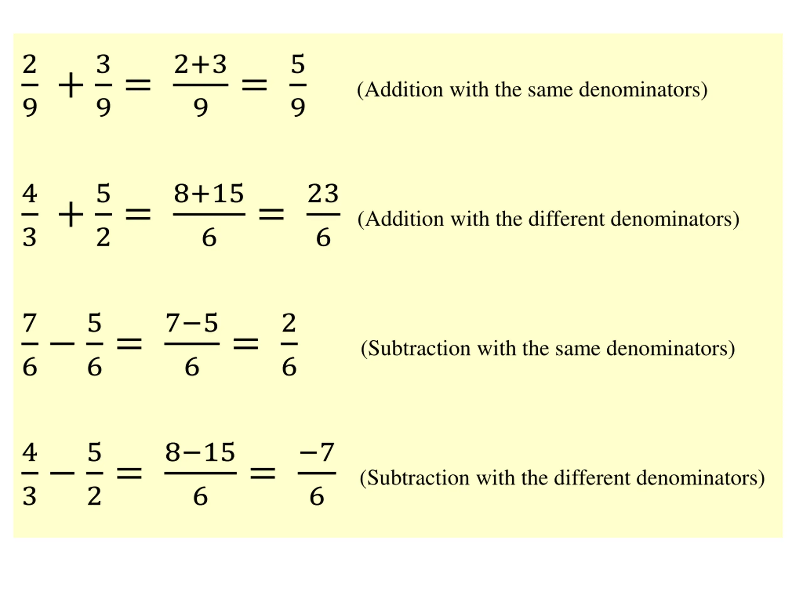 2 9+3 2+3 9 5 9 9= = (Addition with the same denominators) 4 3+5 8+15 6 23 6 2= = (Addition with the different denominators) 7 6 5 7 5 6 2 6 6= = (Subtraction with the same denominators) 4 3 5 8 15 6 7 6 2= = (Subtraction with the different denominators)