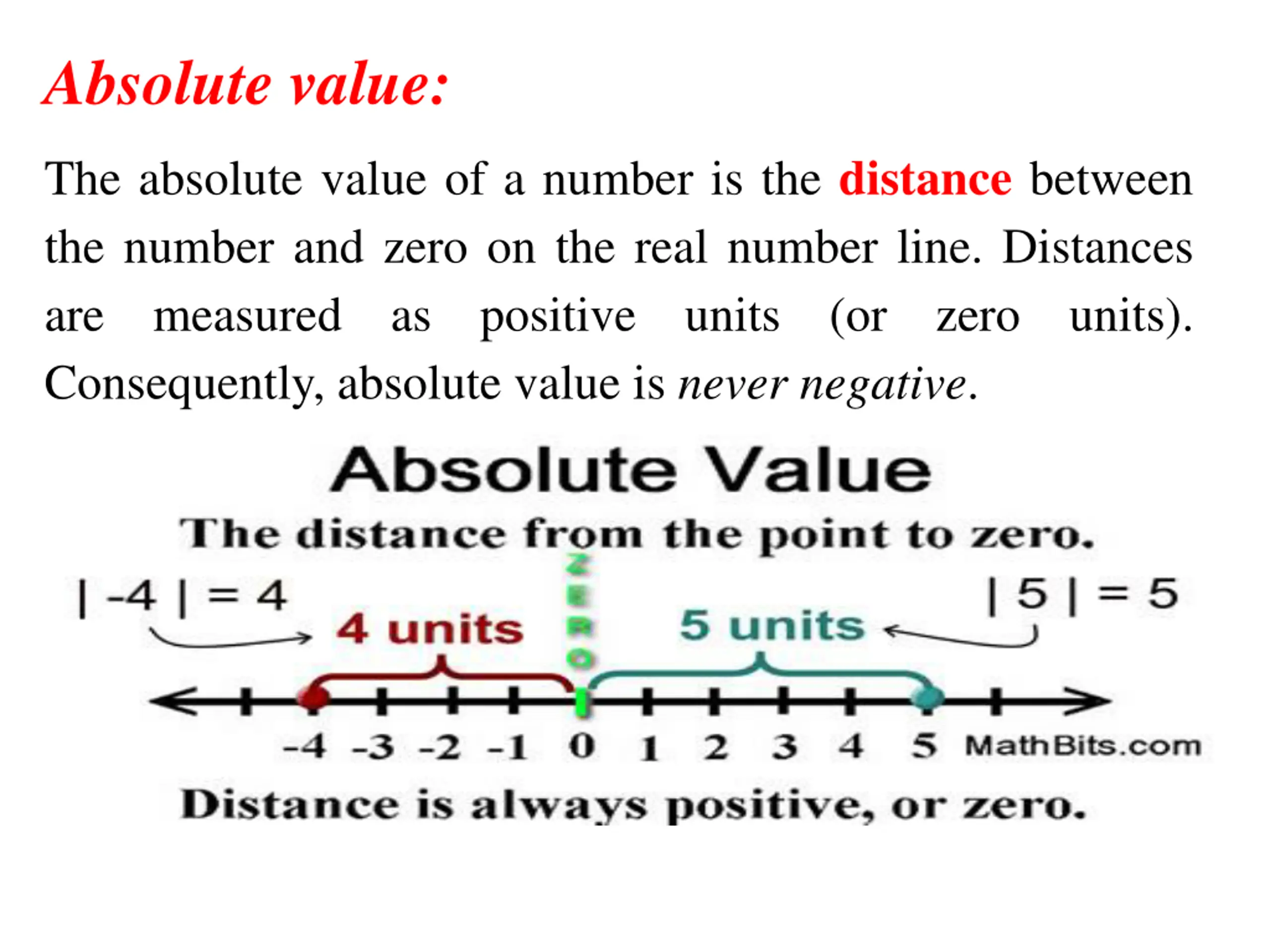 Absolute value: The absolute value of a number is the distance between the number and zero on the real number line. Distances are measured as positive units (or zero units). Consequently, absolute value is never negative.