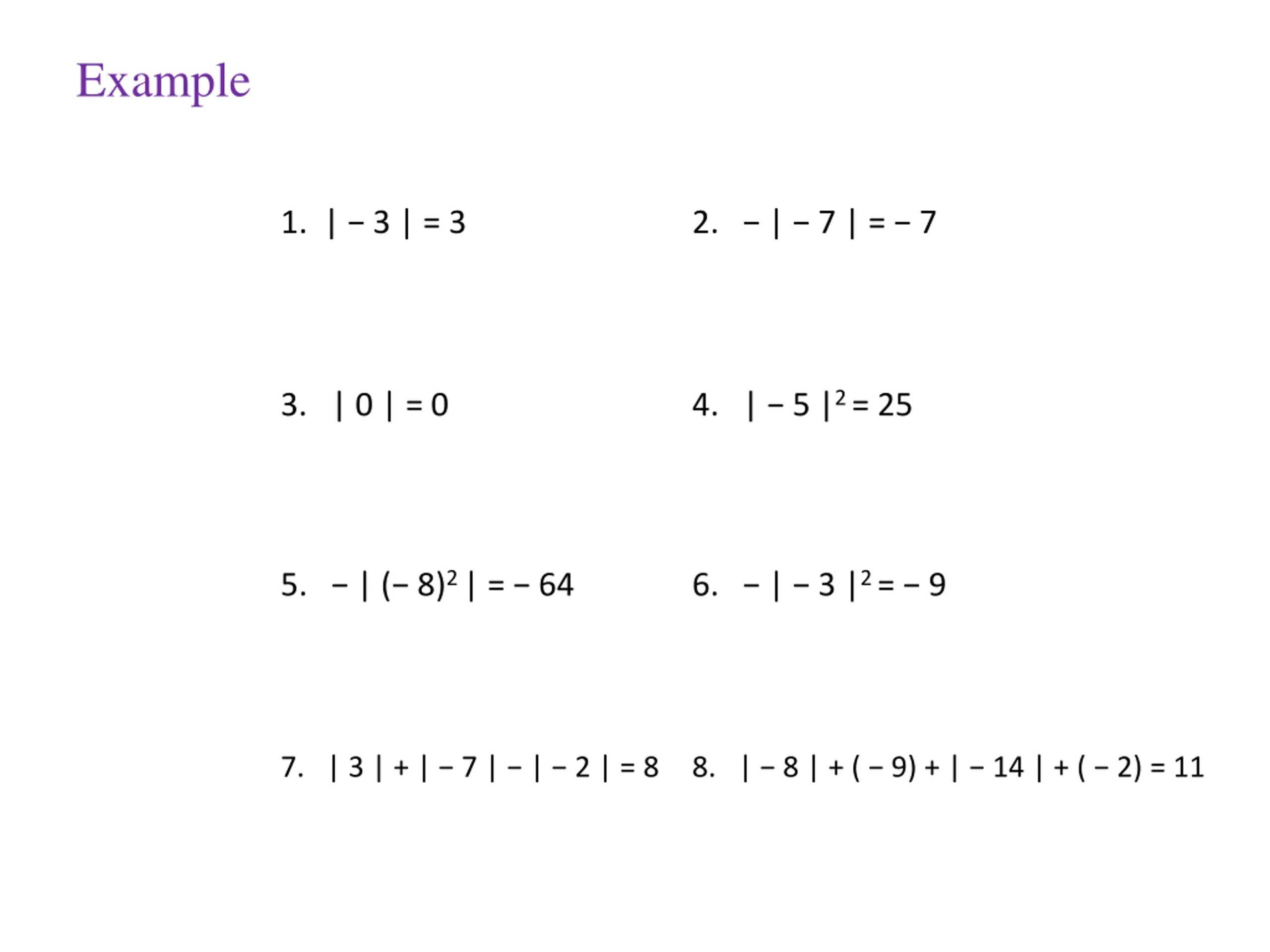 Example 1. | 3 | = 3 2. | 7 | = 7 4. | 5 |2 = 25 3. | 0 | = 0 5. | ( 8)2 | = 64 6. | 3 |2 = 9 7. | 3 | + | 7 | | 2 | = 8 8. | 8 | + ( 9) + | 14 | + ( 2) = 11