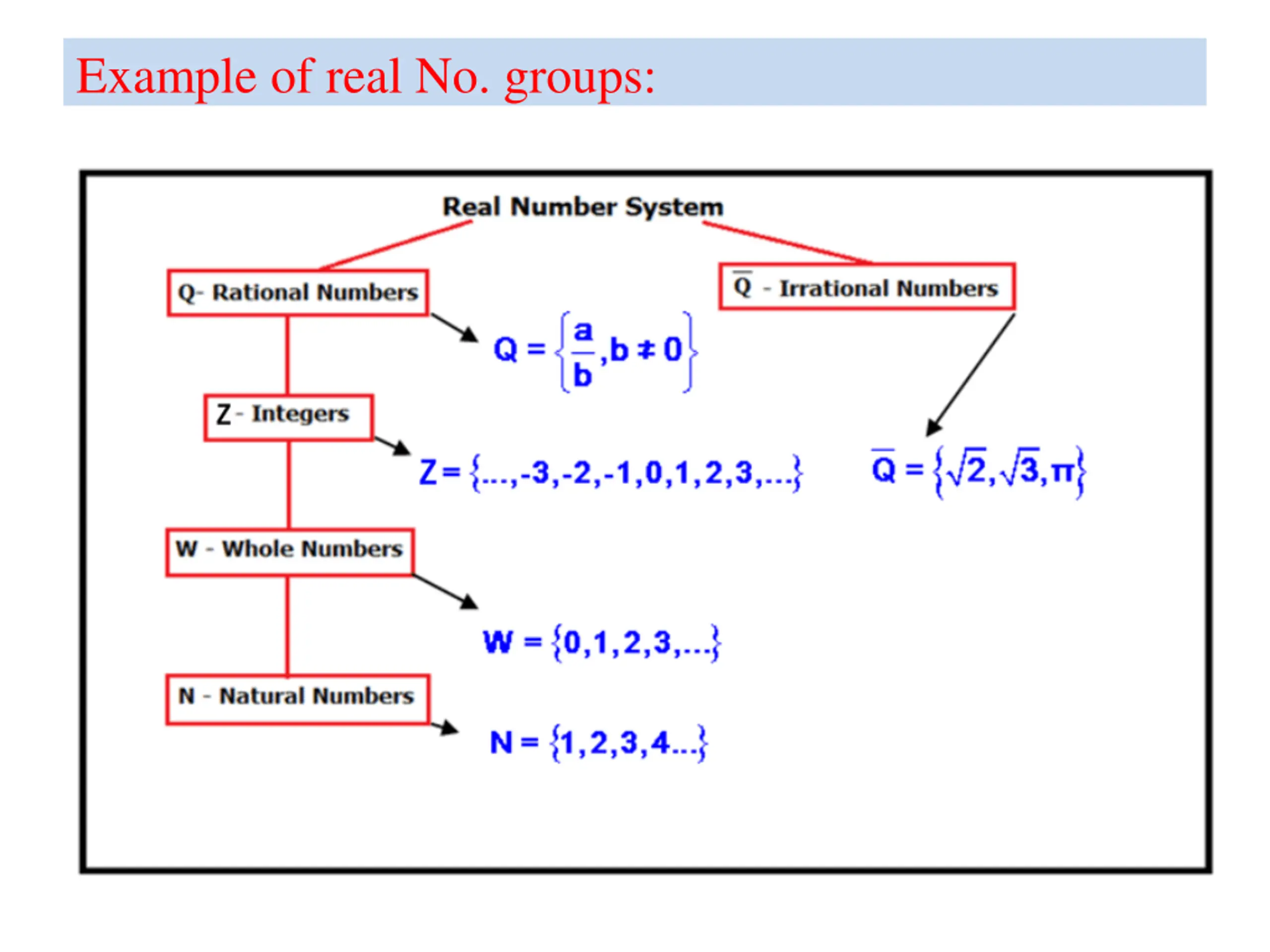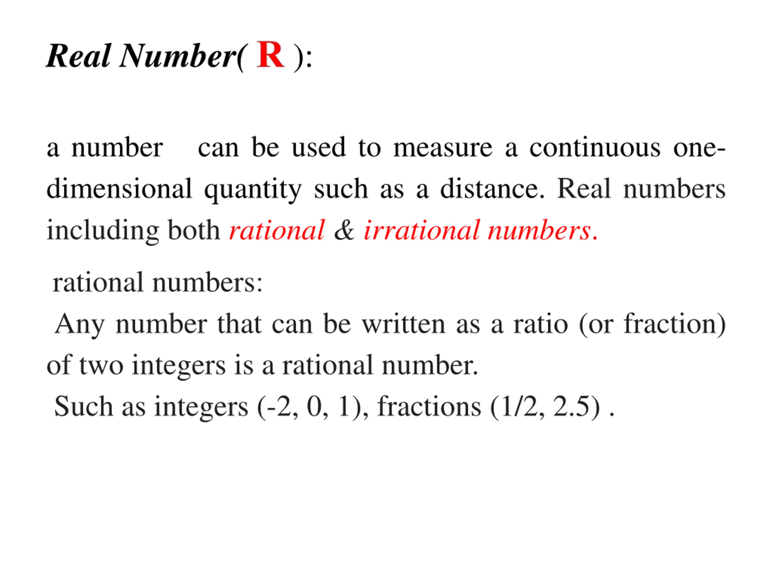 Real Number( R ): a number dimensional quantity such as a distance. Real numbers including both rational & irrational numbers. can be used to measure a continuous one- rational numbers: Any number that can be written as a ratio (or fraction) of two integers is a rational number. Such as integers (-2, 0, 1), fractions (1/2, 2.5) .