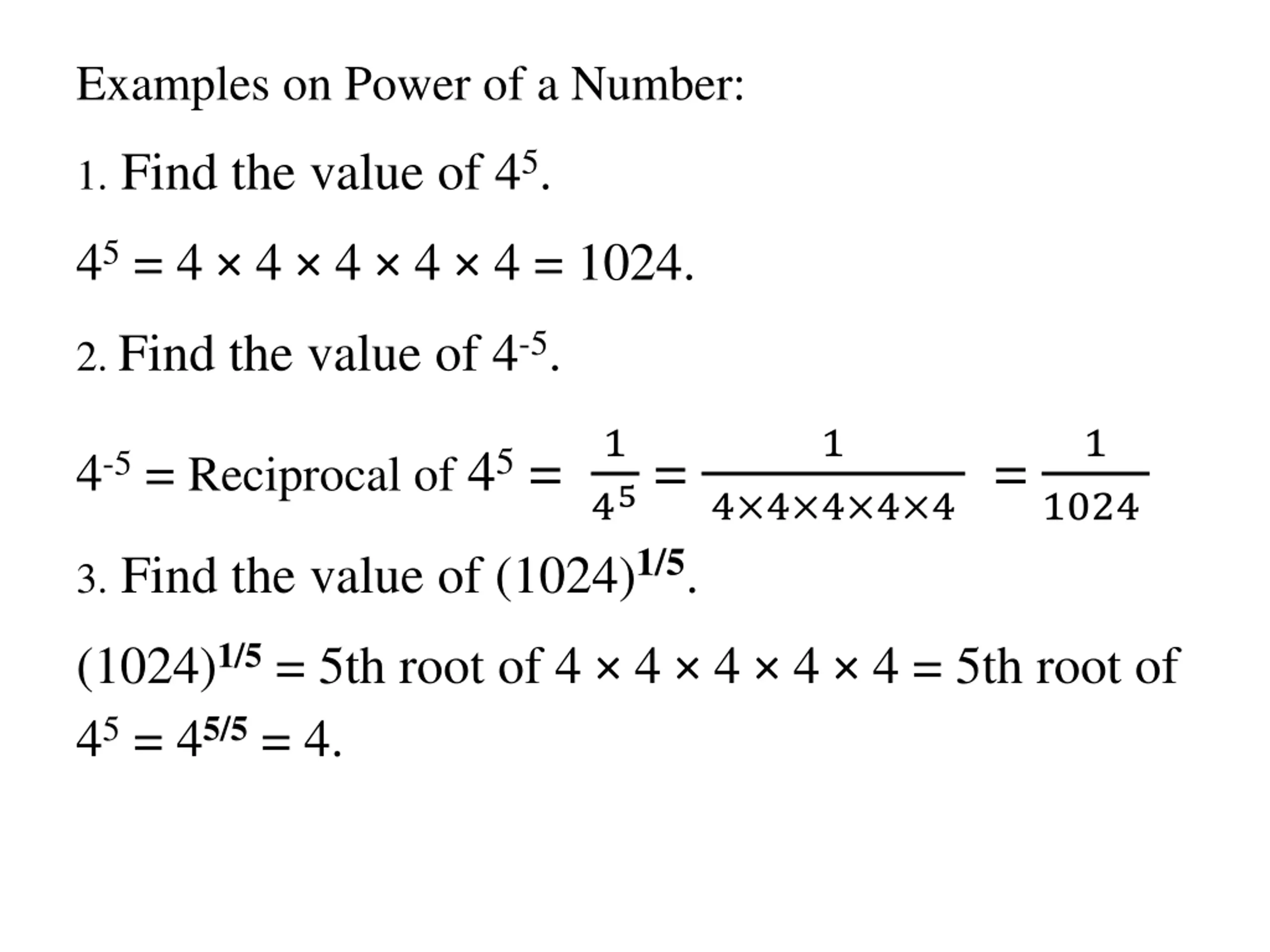 Examples on Power of a Number: 1. Find the value of 45. 45= 4 4 4 4 4 = 1024. 2. Find the value of 4-5. 4-5= Reciprocal of 45= 1 1 1 45= 4 4 4 4 4= 1024 3. Find the value of (1024)1/5. (1024)1/5= 5th root of 4 4 4 4 4 = 5th root of 45= 45/5= 4.