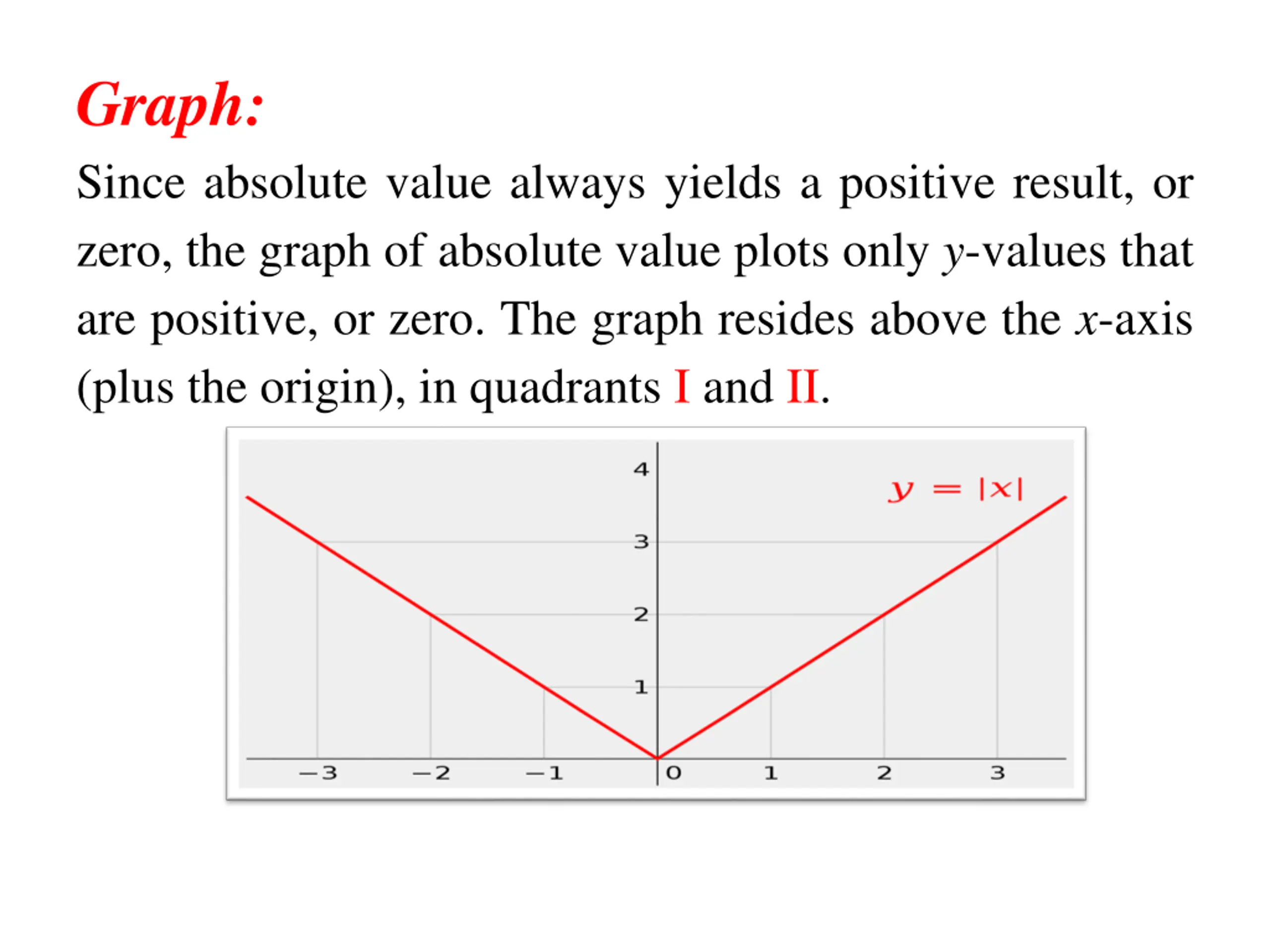 Graph: Since absolute value always yields a positive result, or zero, the graph of absolute value plots only y-values that are positive, or zero. The graph resides above the x-axis (plus the origin), in quadrants I and II.