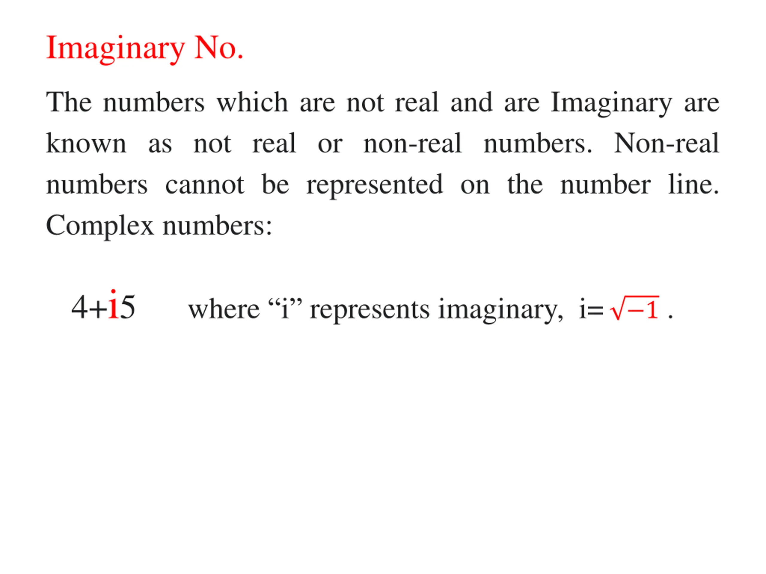 Imaginary No. The numbers which are not real and are Imaginary are known as not real or non-real numbers. Non-real numbers cannot be represented on the number line. Complex numbers: 4+i5 where i represents imaginary, i= 1 .