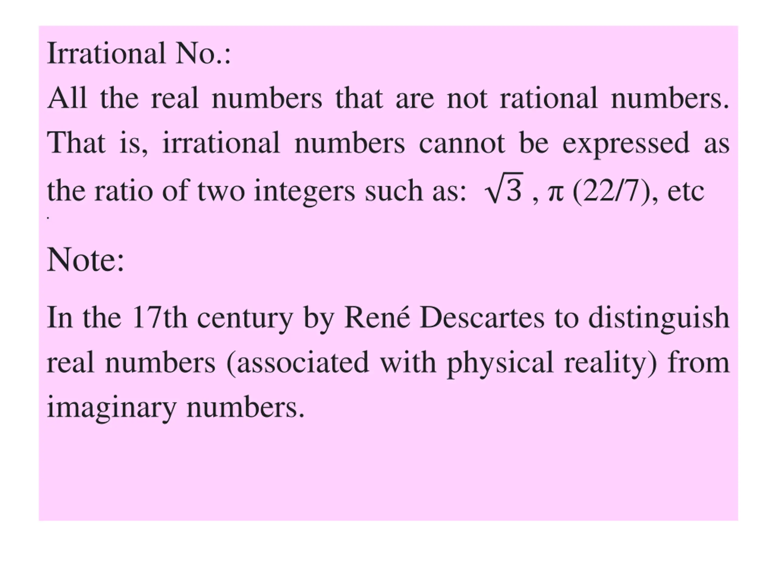 Irrational No.: All the real numbers that are not rational numbers. That is, irrational numbers cannot be expressed as the ratio of two integers such as: 3 , (22/7), etc Note: In the 17th century by Ren Descartes to distinguish real numbers (associated with physical reality) from imaginary numbers.