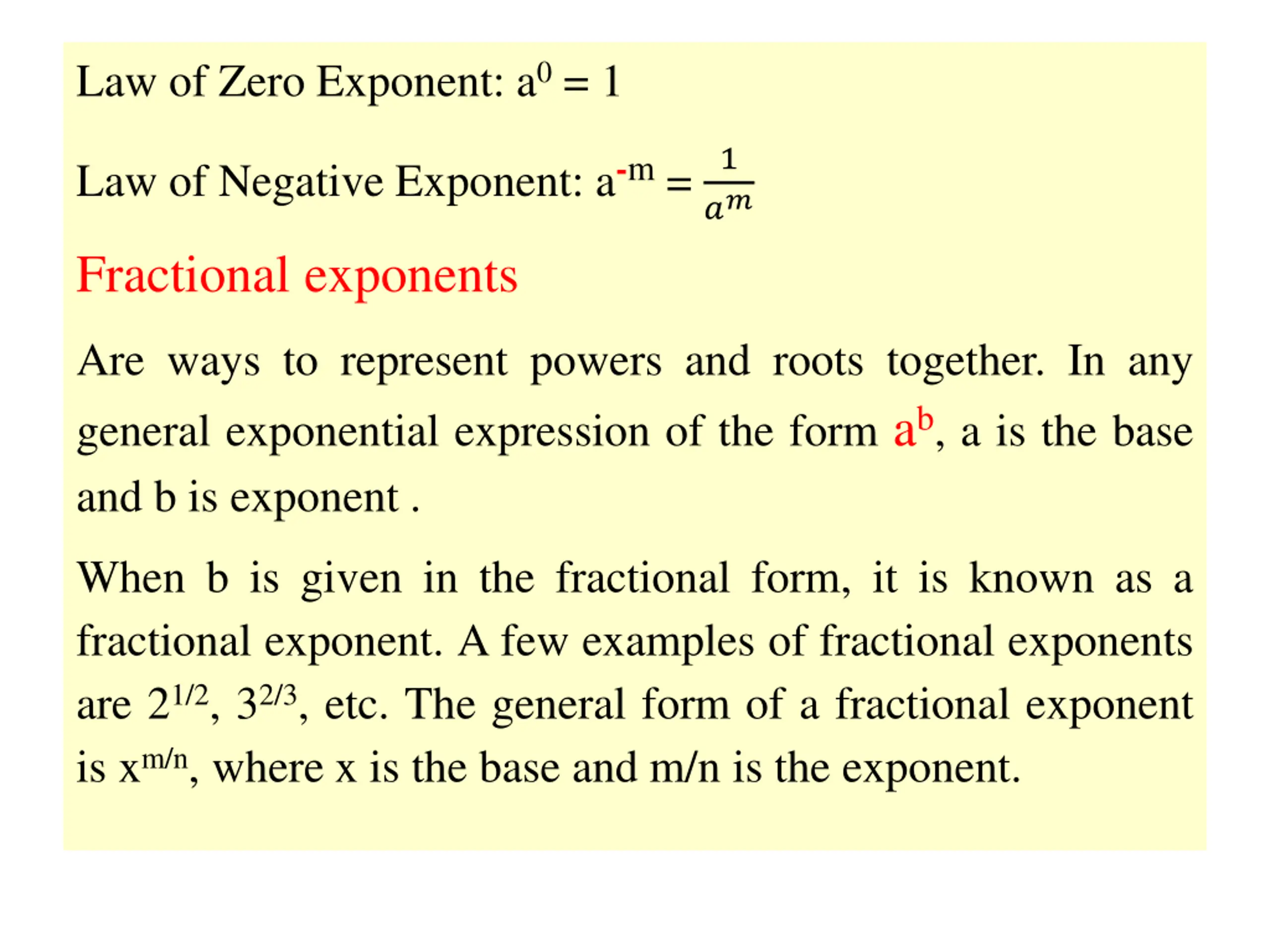 Law of Zero Exponent: a0= 1 1 Law of Negative Exponent: a-m= ?? Fractional exponents Are ways to represent powers and roots together. In any general exponential expression of the form ab, a is the base and b is exponent . When b is given in the fractional form, it is known as a fractional exponent. A few examples of fractional exponents are 21/2, 32/3, etc. The general form of a fractional exponent is xm/n, where x is the base and m/n is the exponent.