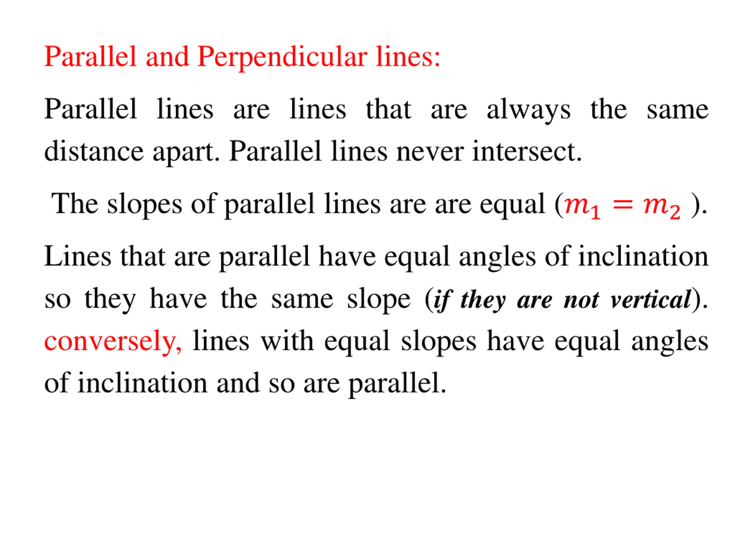 Parallel and Perpendicular lines: Parallel lines are lines that are always the same distance apart. Parallel lines never intersect. The slopes of parallel lines are are equal (?1= ?2 ). Lines that are parallel have equal angles of inclination so they have the same slope (if they are not vertical). conversely, lines with equal slopes have equal angles of inclination and so are parallel.
