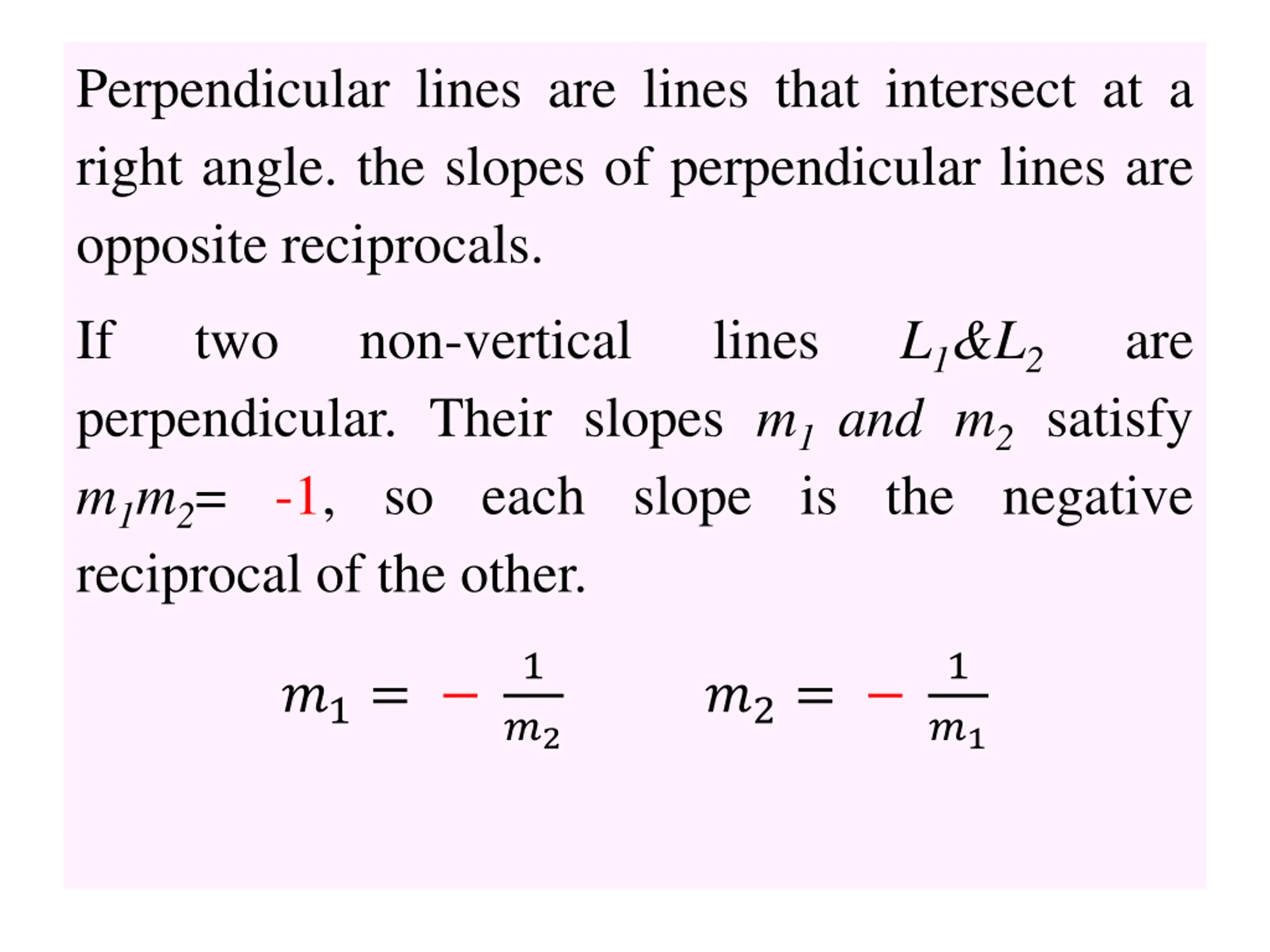 Perpendicular lines are lines that intersect at a right angle. the slopes of perpendicular lines are opposite reciprocals. If perpendicular. Their slopes m1 and m2 satisfy m1m2= -1, so each slope is the negative reciprocal of the other. two non-vertical lines L1&L2 are 1 1 ?2?2= ?1= ?1