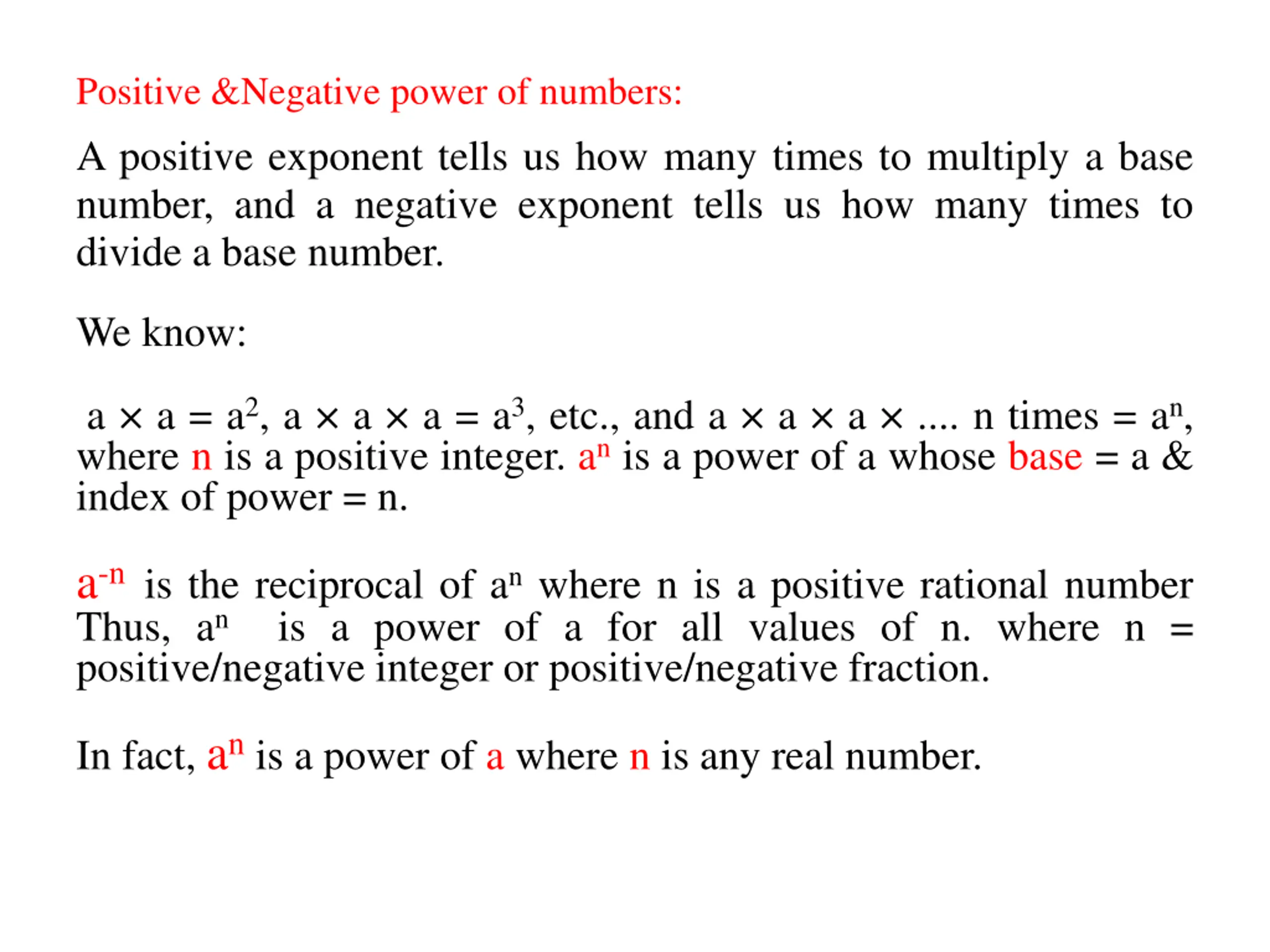 Positive &Negative power of numbers: A positive exponent tells us how many times to multiply a base number, and a negative exponent tells us how many times to divide a base number. We know: a a = a2, a a a = a3, etc., and a a a .... n times = an, where n is a positive integer. anis a power of a whose base = a & index of power = n. a-nis the reciprocal of anwhere n is a positive rational number Thus, an is a power of a for all values of n. where n = positive/negative integer or positive/negative fraction. In fact, anis a power of a where n is any real number.