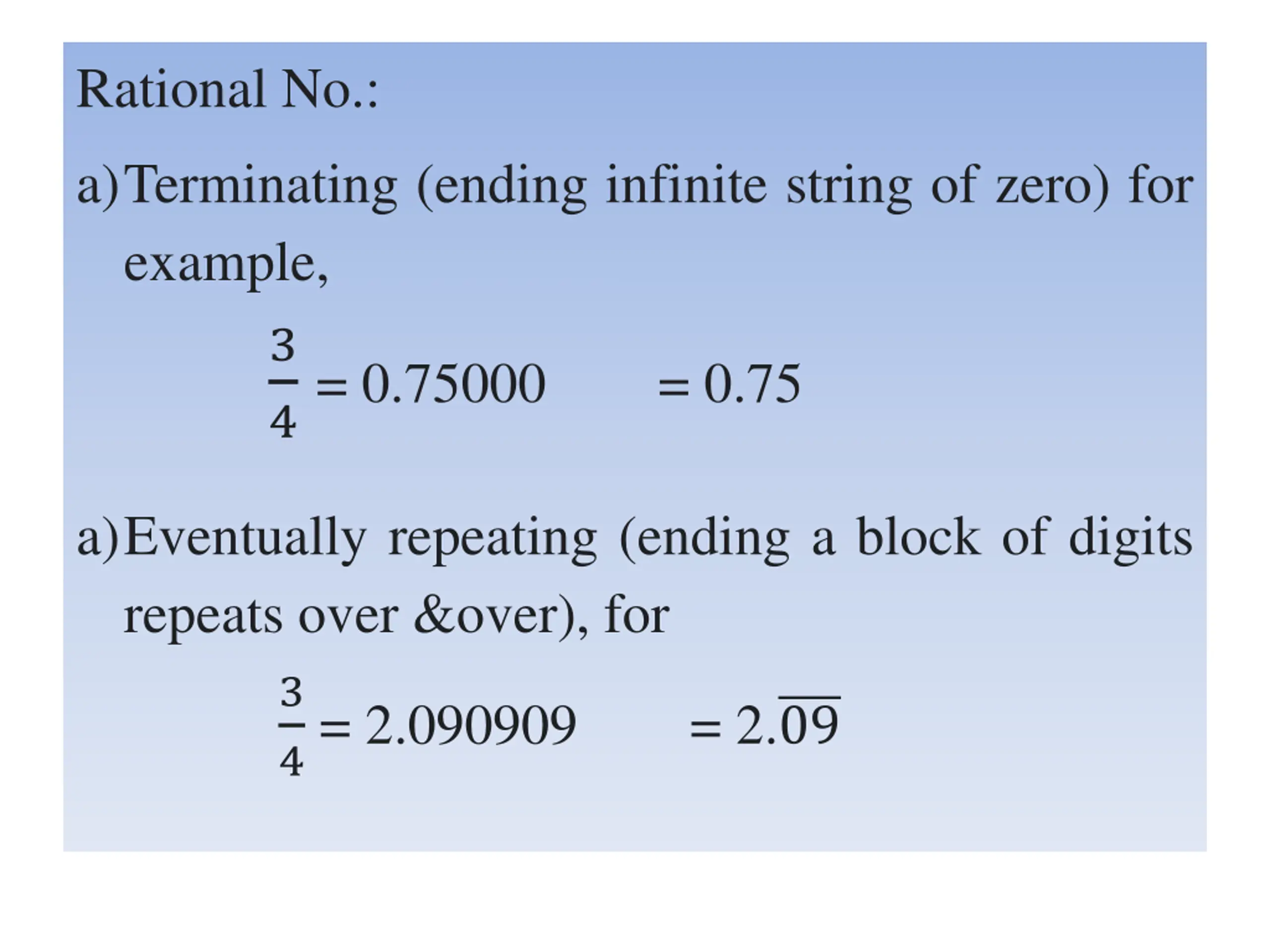 Rational No.: a)Terminating (ending infinite string of zero) for example, 3 4= 0.75000 = 0.75 a)Eventually repeating (ending a block of digits repeats over &over), for 3 4= 2.090909 = 2.09