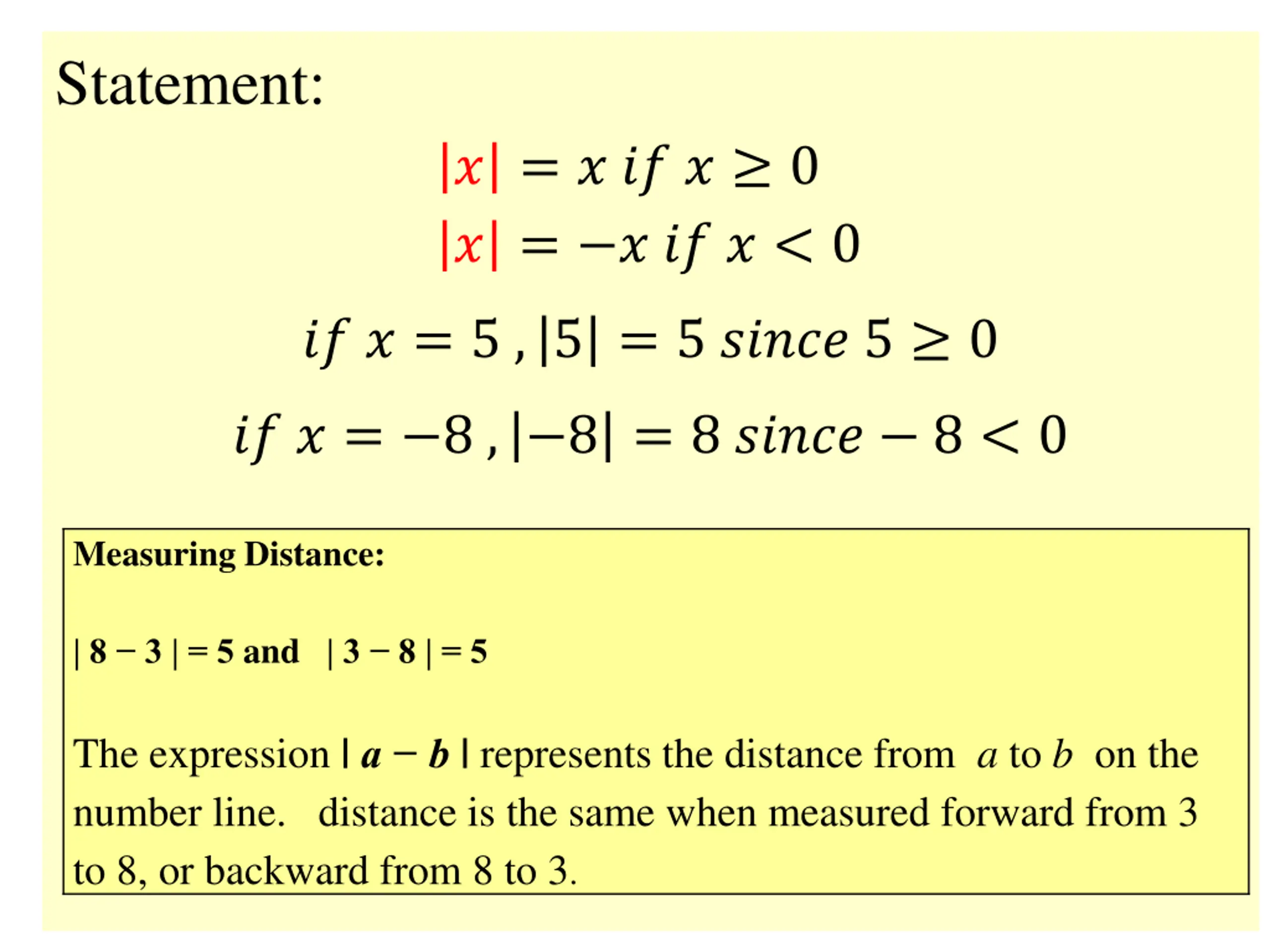Statement: ? = ? ?? ? 0 ? = ? ?? ? < 0 ?? ? = 5 , 5 = 5 ????? 5 0 ?? ? = 8 , 8 = 8 ????? 8 < 0 Measuring Distance: | 8 3 | = 5 and | 3 8 | = 5 The expression | a b | represents the distance from a to b on the number line. distance is the same when measured forward from 3 to 8, or backward from 8 to 3.