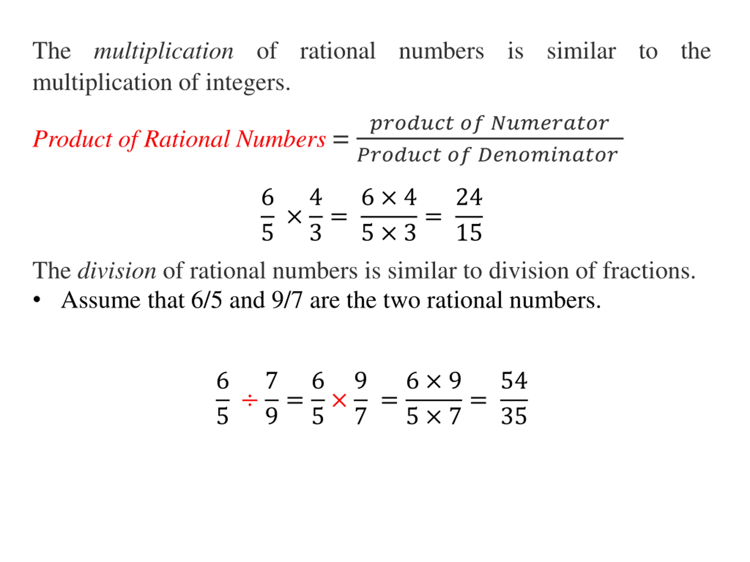 The multiplication of integers. of rational numbers is similar to the multiplication ??????? ?? ????????? ??????? ?? ??????????? Product of Rational Numbers = 6 5 4 6 4 5 3= 24 15 3= The division of rational numbers is similar to division of fractions. Assume that 6/5 and 9/7 are the two rational numbers. 6 5 7 9=6 5 9 7=6 9 54 35 5 7=