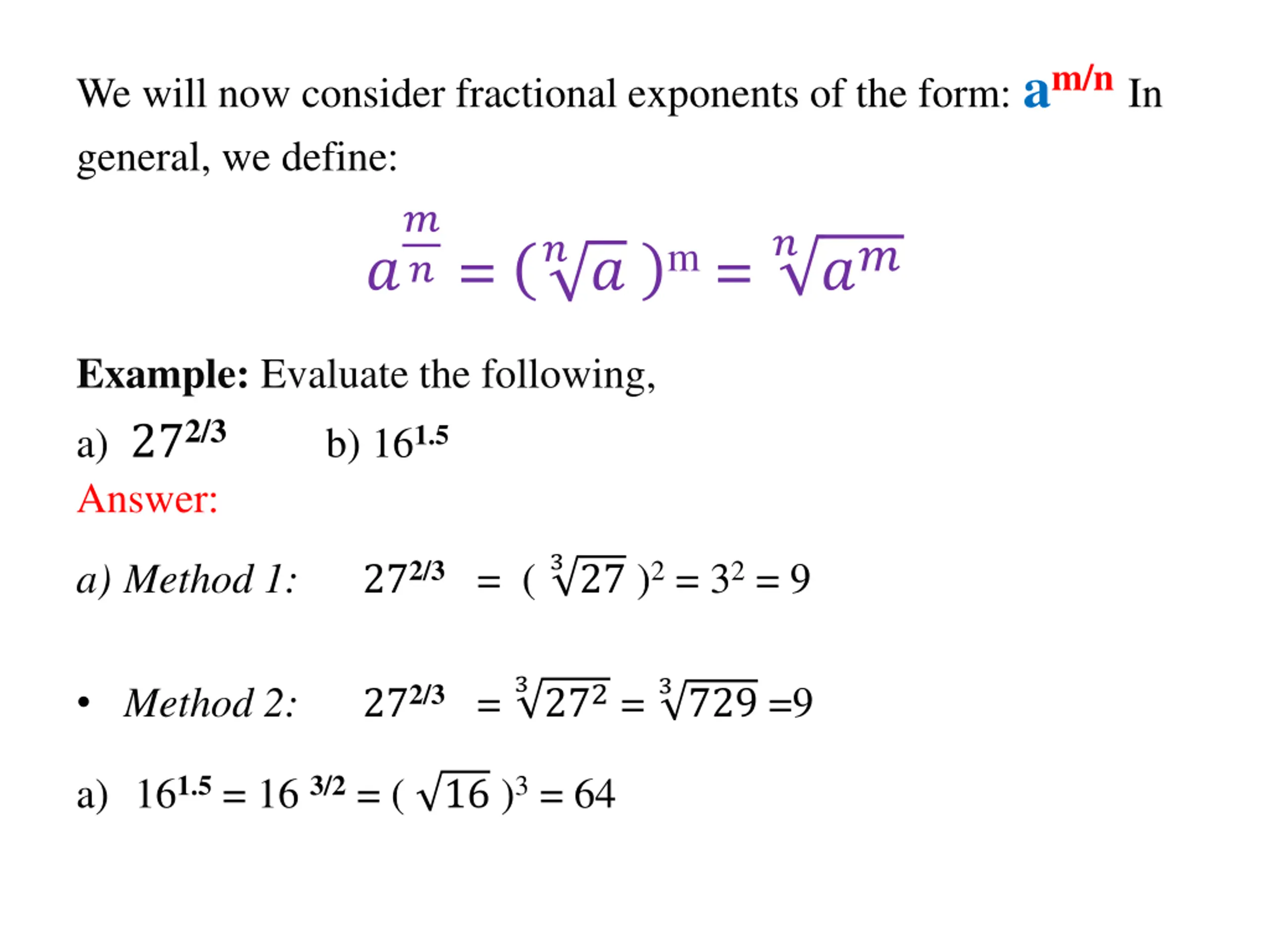 We will now consider fractional exponents of the form: am/nIn general, we define: ? ? = ??? ?? m = ? Example: Evaluate the following, a) 272/3b) 161.5 Answer: 327 )2 = 32 = 9 a) Method 1: 272/3 = ( 3272 = 3729 =9 Method 2: 272/3 = a) 161.5 = 16 3/2 = ( 16 )3 = 64