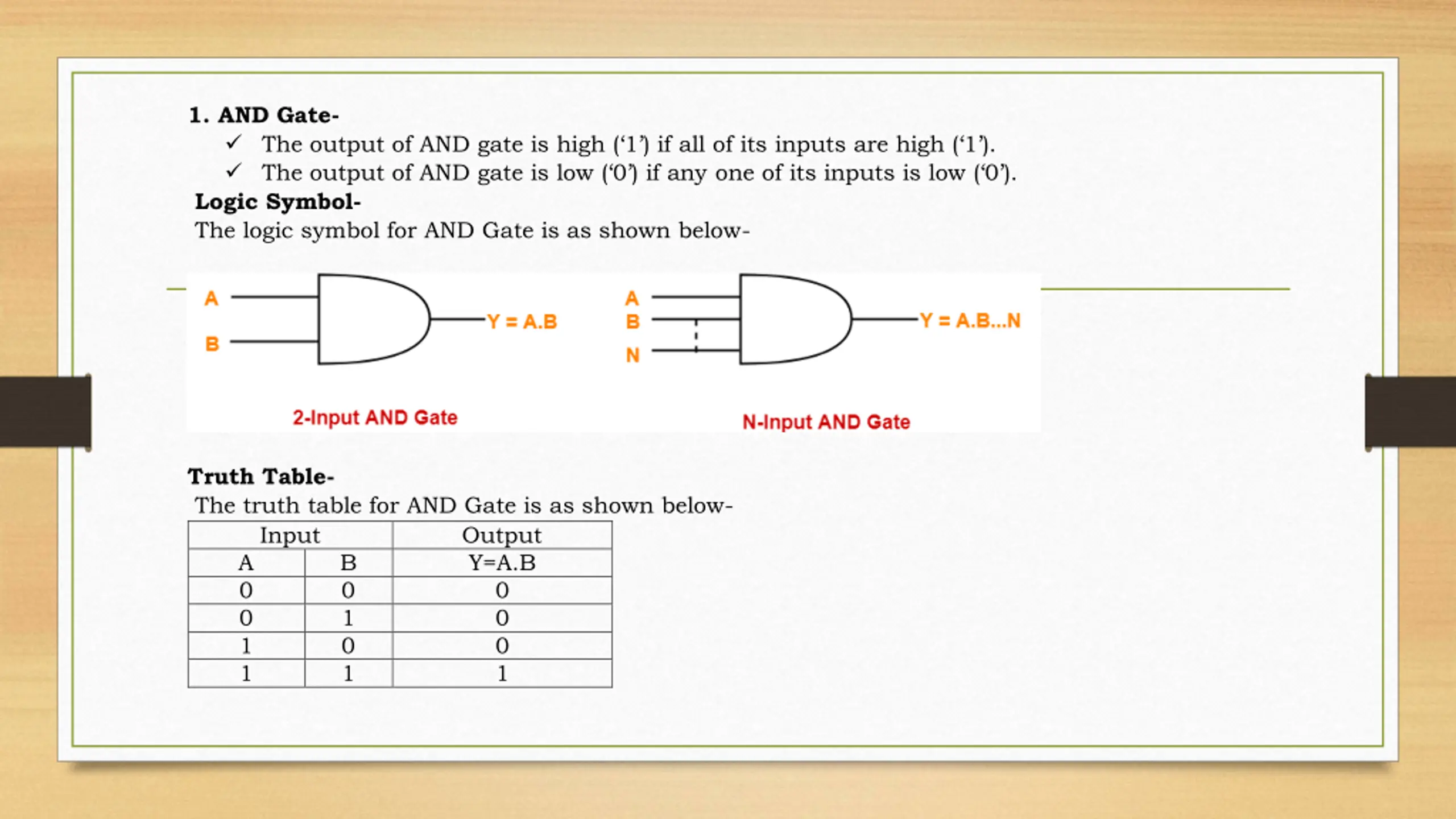1. AND Gate- The output of AND gate is high ( 1 ) if all of its inputs are high ( 1 ). The output of AND gate is low ( 0 ) if anyone of its inputs is low ( 0 ). Logic Symbol- The logic symbol for AND Gate is as shown below- Truth Table- The truth table for AND Gate is as shown below- Input Output A B 0 0 0 1 1 0 1 1 Y=A.B 0 0 0 1