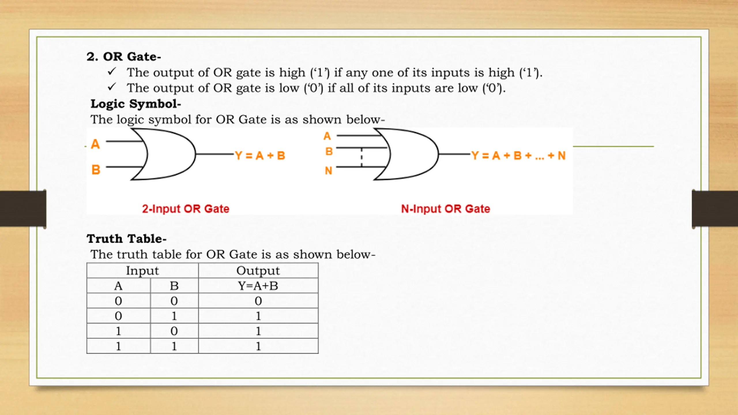 2. OR Gate- The output of OR gate is high ( 1 ) if any one of its inputs is high ( 1 ). The output of OR gate is low ( 0 ) if all of its inputs are low ( 0 ). Logic Symbol- The logic symbol for OR Gate is as shown below- Truth Table- The truth table for OR Gate is as shown below- Input A B 0 0 0 1 1 0 1 1 Output Y=A+B 0 1 1 1