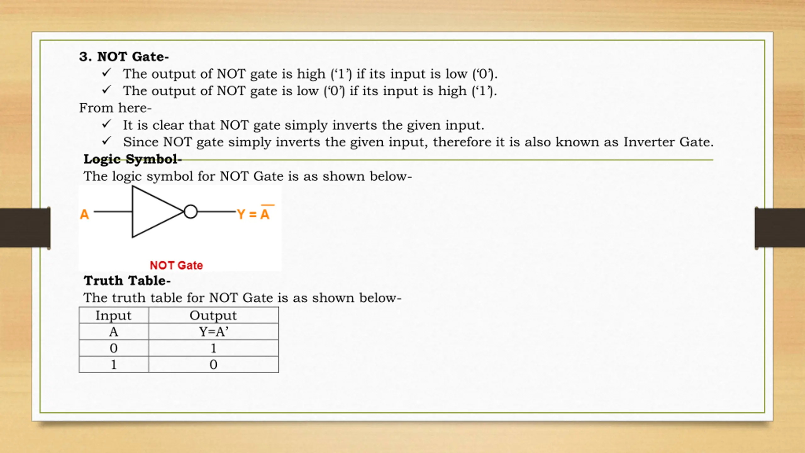 3. NOT Gate- The output of NOT gate is high ( 1 ) if itsinput is low ( 0 ). The output of NOT gate is low ( 0 ) if its input is high ( 1 ). From here- It is clear that NOT gate simply inverts the given input. Since NOT gate simply inverts the given input, therefore it is also known as Inverter Gate. Logic Symbol- The logic symbol for NOT Gate is as shown below- Truth Table- The truth table for NOT Gate is as shown below- Input Output A Y=A 0 1 1 0