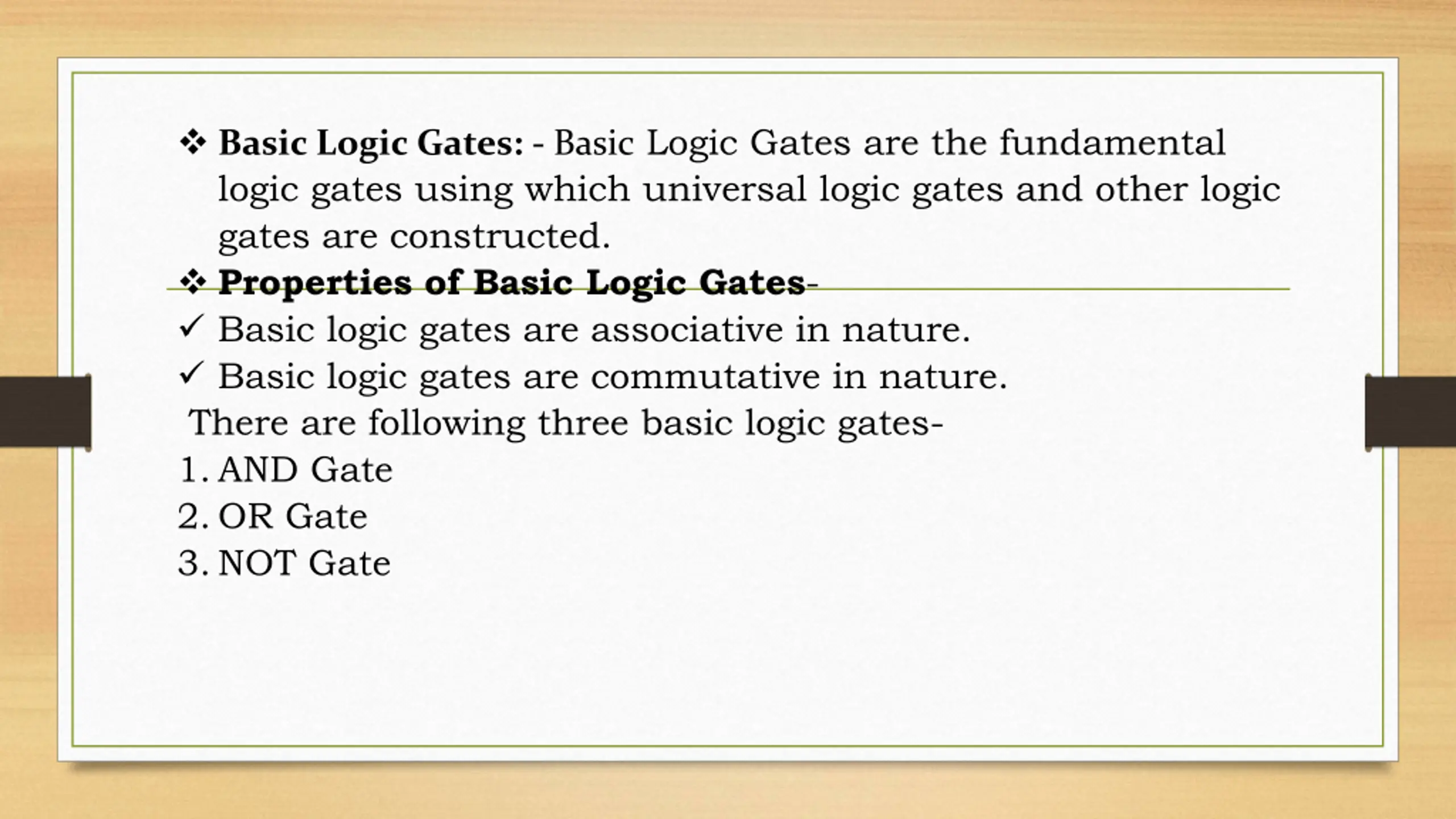 Basic Logic Gates: - Basic Logic Gates are the fundamental logic gates using which universal logic gates and other logic gates are constructed. Properties of Basic Logic Gates- Basic logic gates are associative in nature. Basic logic gates are commutative in nature. There are following three basic logic gates- 1.AND Gate 2.OR Gate 3.NOT Gate