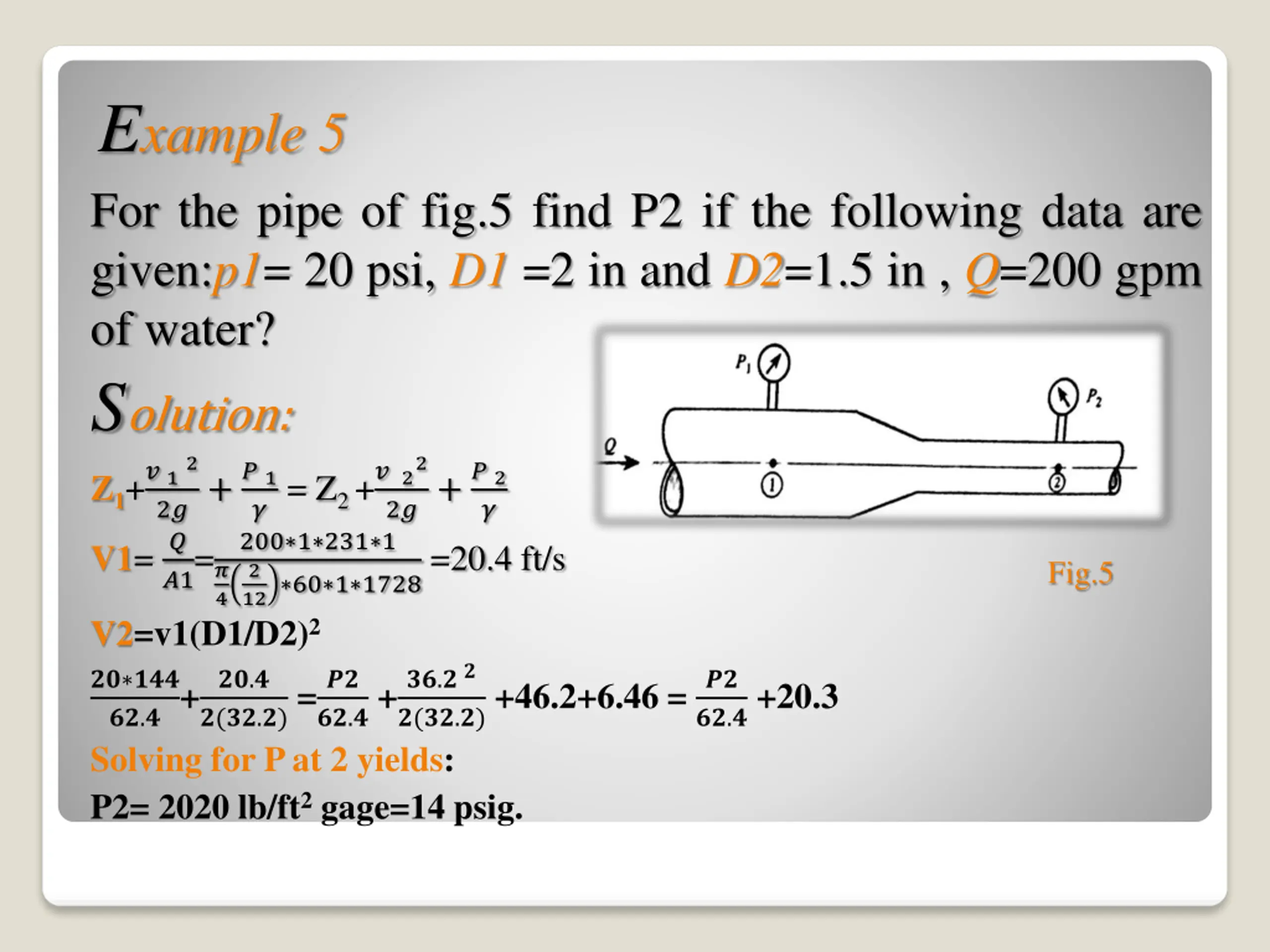 Example 5 For the pipe of fig.5 find P2 if the following data are given:p1= 20 psi, D1 =2 in and D2=1.5 in , Q=200 gpm of water? Solution: Z1+? 12 ? V1= ? 4 V2=v1(D1/D2)2 ??.? +??.? ? Solving for P at 2 yields: P2= 2020 lb/ft2 gage=14 psig. ? = Z2 +? 22 200 1 231 1 2 2?+? 1 ? ?1= 2?+? 2 12 60 1 1728 =20.4 ft/s Fig.5 ?? ??? ??.?+ ??.? ?(??.?) =?? ?? ??.? +20.3 ?(??.?) +46.2+6.46 =