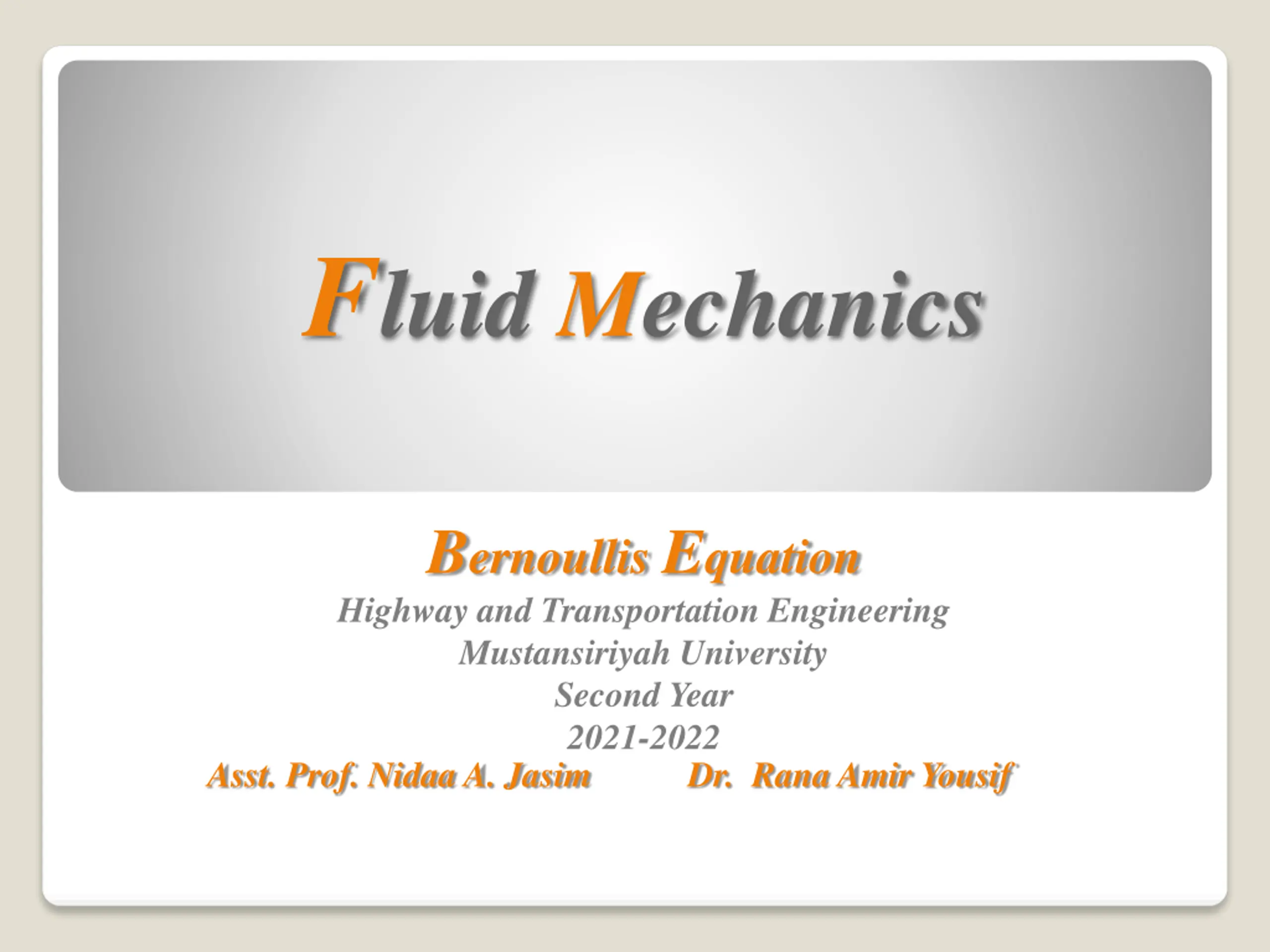 Fluid Mechanics BernoullisEquation Highway and Transportation Engineering Mustansiriyah University Second Year 2021-2022 Asst. Prof. Nidaa A. Jasim Dr. Rana Amir Yousif