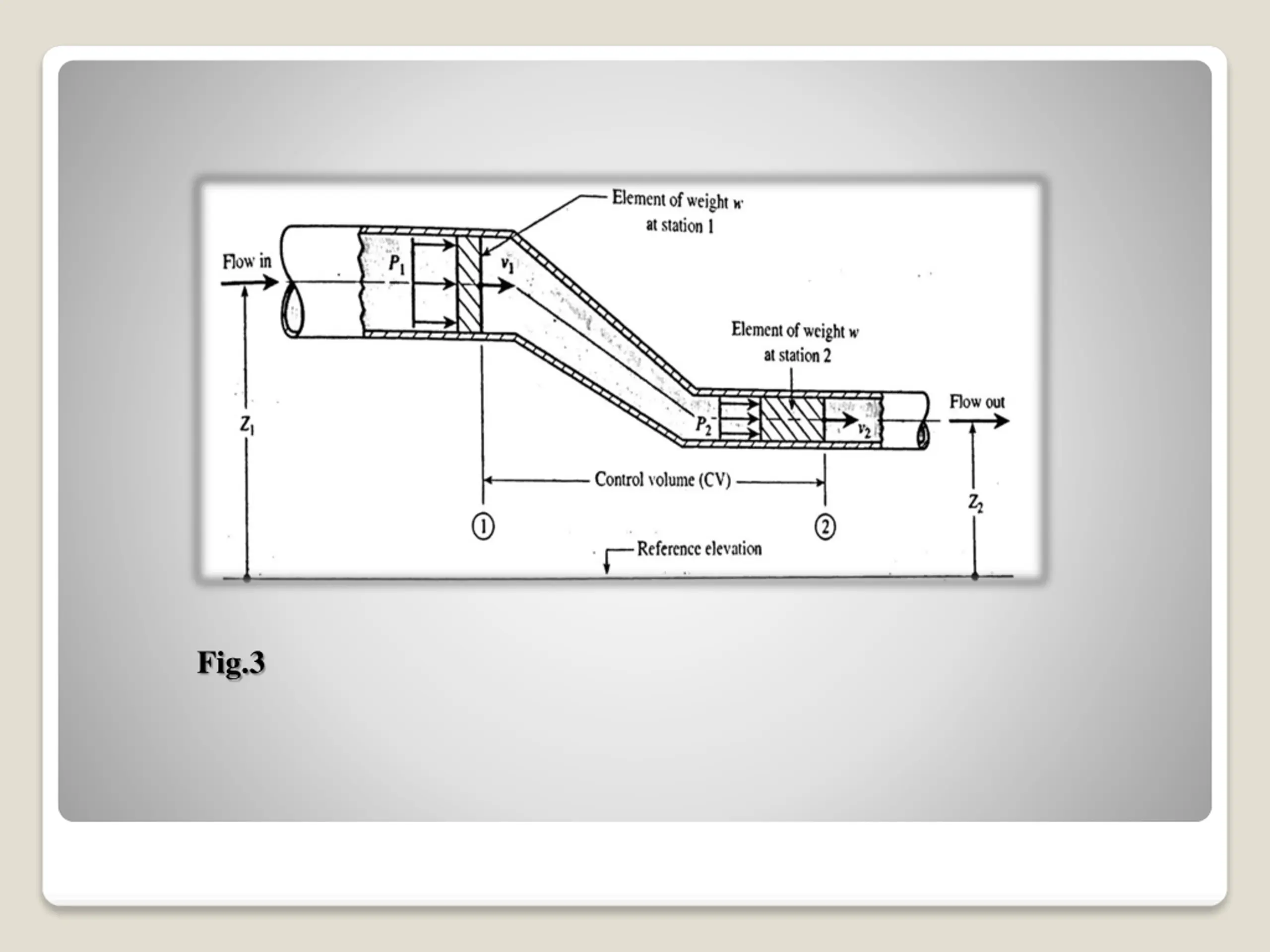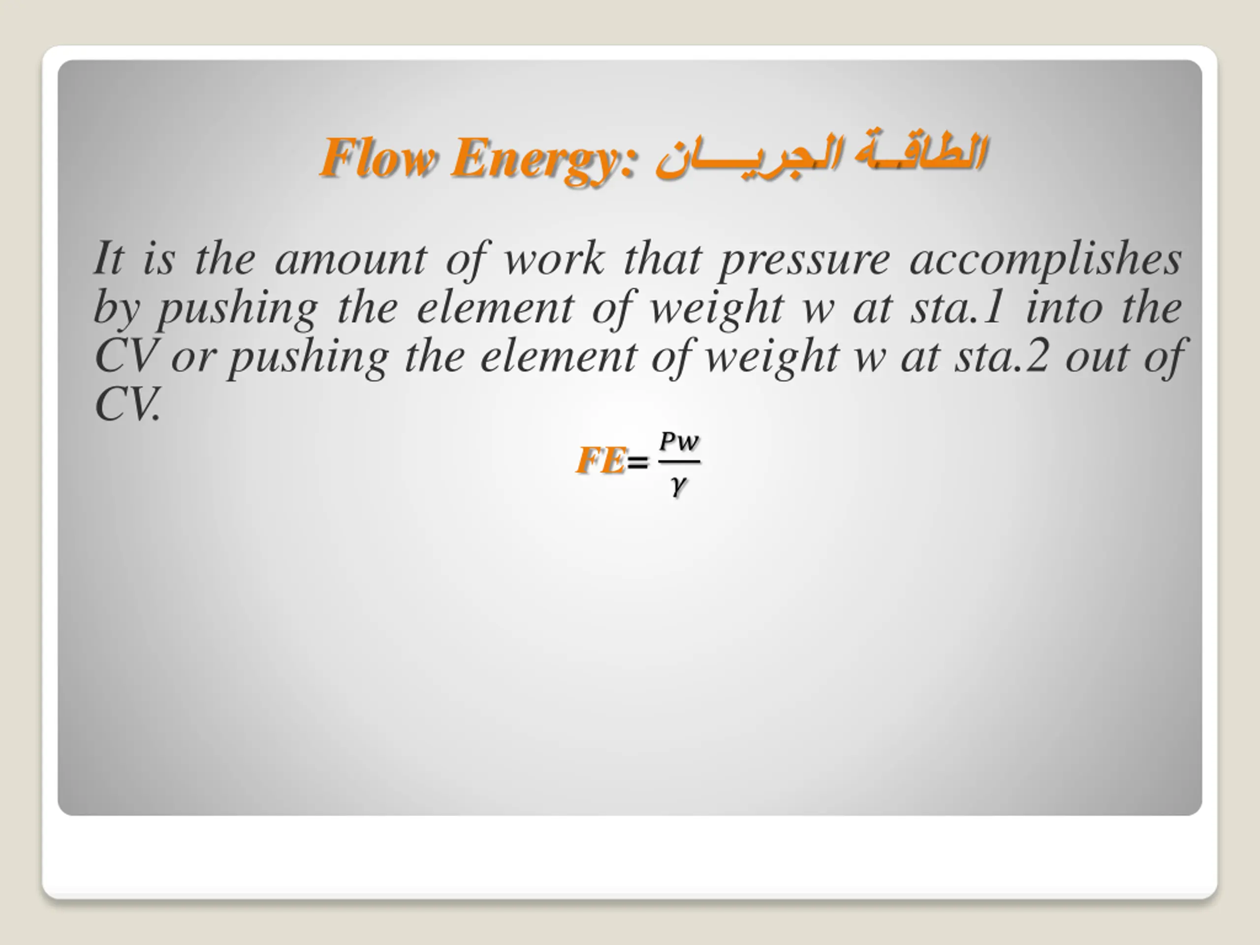 Flow Energy: It is the amount of work that pressure accomplishes by pushing the element of weight w at sta.1 into the CV or pushing the element of weight w at sta.2 out of CV. FE= ?? ?