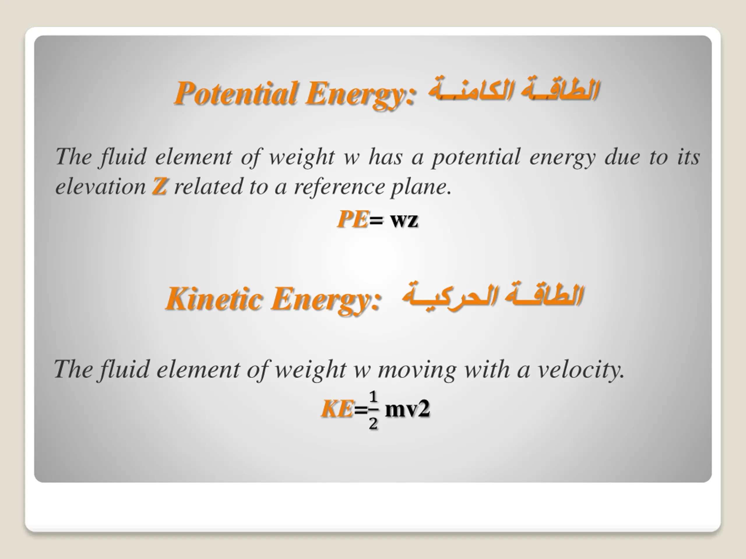 Potential Energy: The fluid element of weight w has a potential energy due to its elevation Z related to a reference plane. PE= wz Kinetic Energy: The fluid element of weight w moving with a velocity. KE=1 2 mv2
