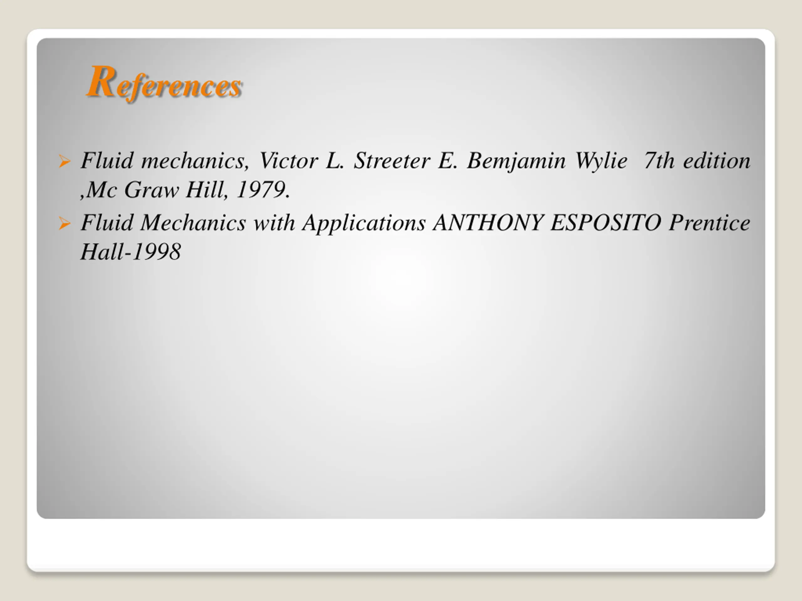 References Fluid mechanics, Victor L. Streeter E. Bemjamin Wylie 7th edition ,Mc Graw Hill, 1979. Fluid Mechanics with Applications ANTHONY ESPOSITO Prentice Hall-1998