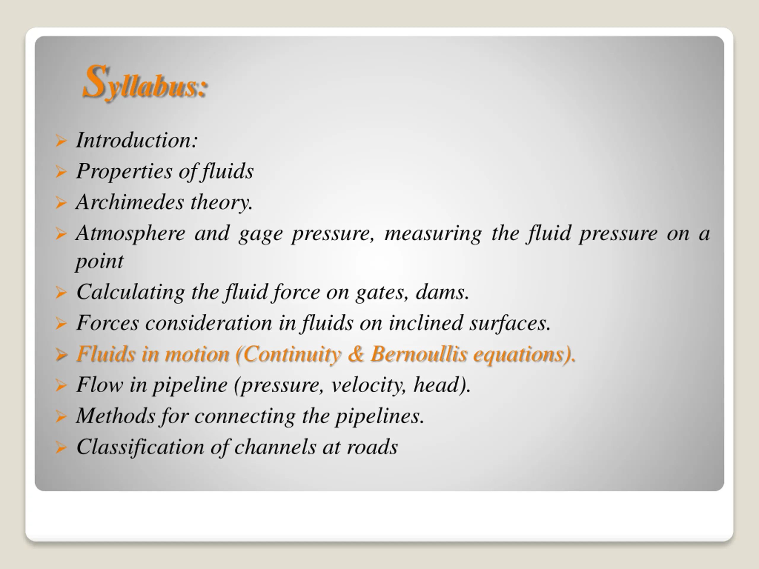 Syllabus: Introduction: Properties of fluids Archimedes theory. Atmosphere and gage pressure, measuring the fluid pressure on a point Calculating the fluid force on gates, dams. Forces consideration in fluids on inclined surfaces. Fluids in motion (Continuity & Bernoullis equations). Flow in pipeline (pressure, velocity, head). Methods for connecting the pipelines. Classification of channels at roads
